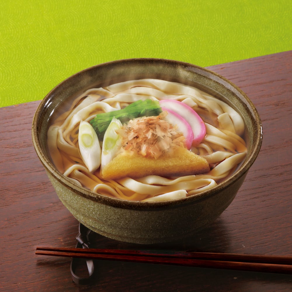 ●ゆできしめん…つるつるとのど越しの良い平打ちめんにめんつゆとかつおの削りぶしをセットした「きしめん」です。