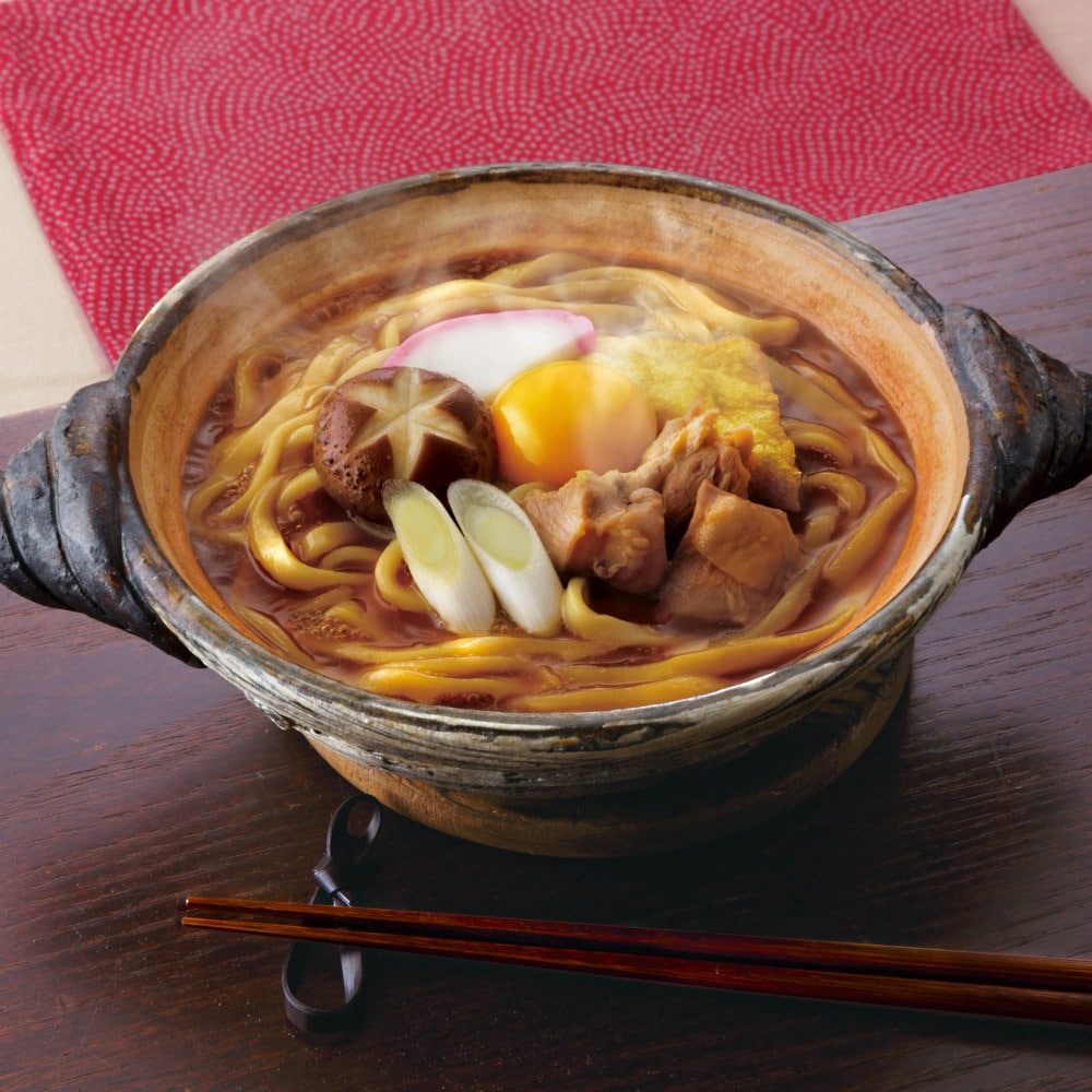 ●ゆで味噌煮込うどん…つるつるとのど越しの良いめんを赤みそベースの味みそで煮込む「みそ煮込うどん」です。
