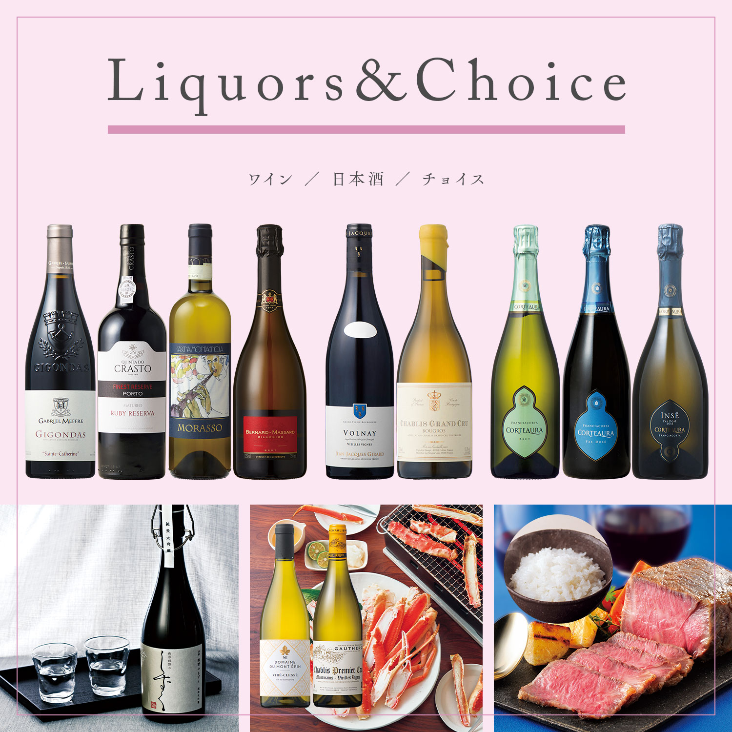 お好きな2点が選べるチョイスギフトはお米と惣菜、白ワインと海鮮、赤ワインとお肉といった、お客様の好みで選べる嬉しいラインナップ。