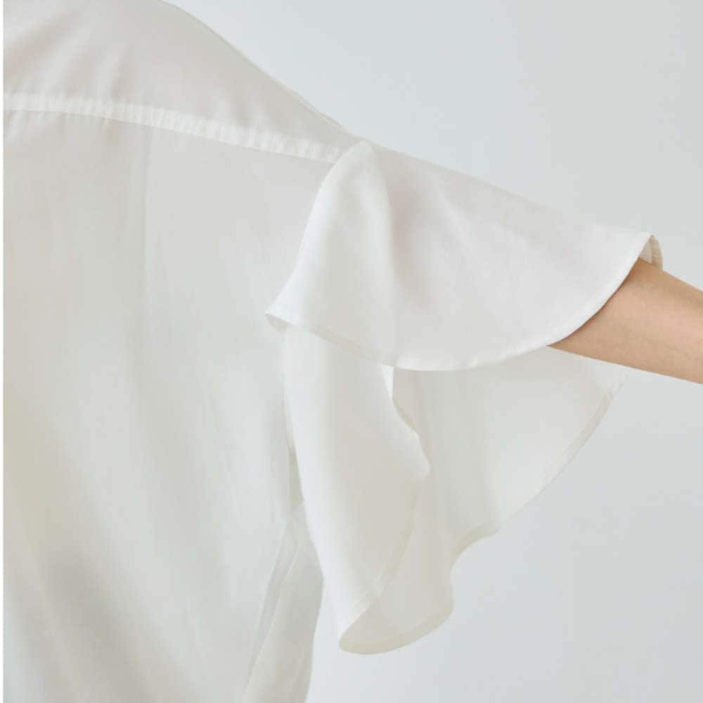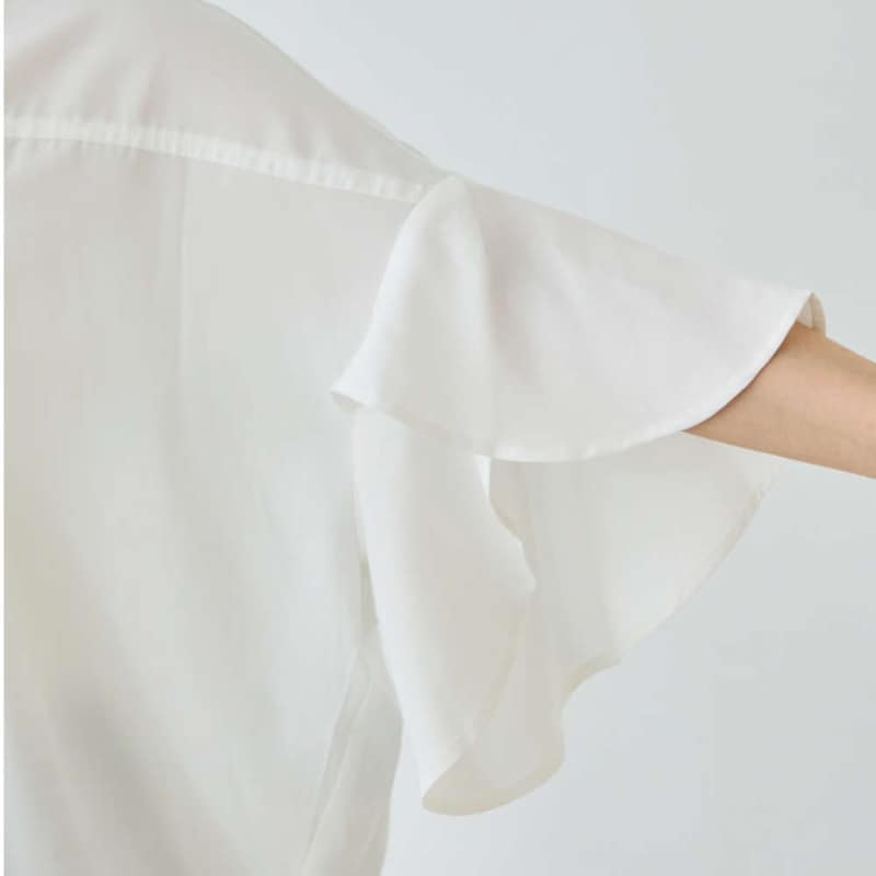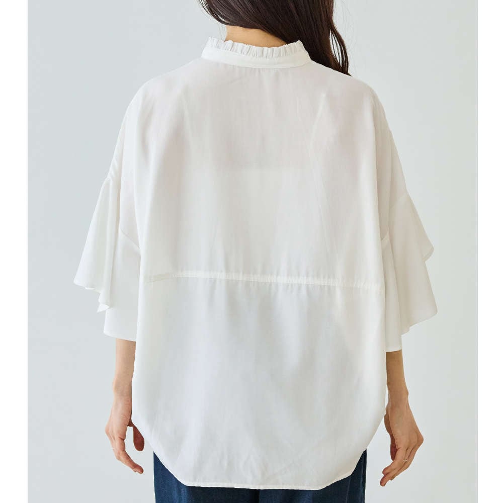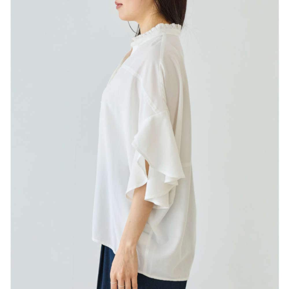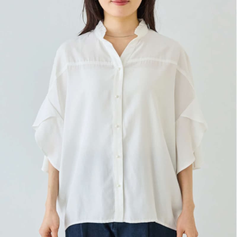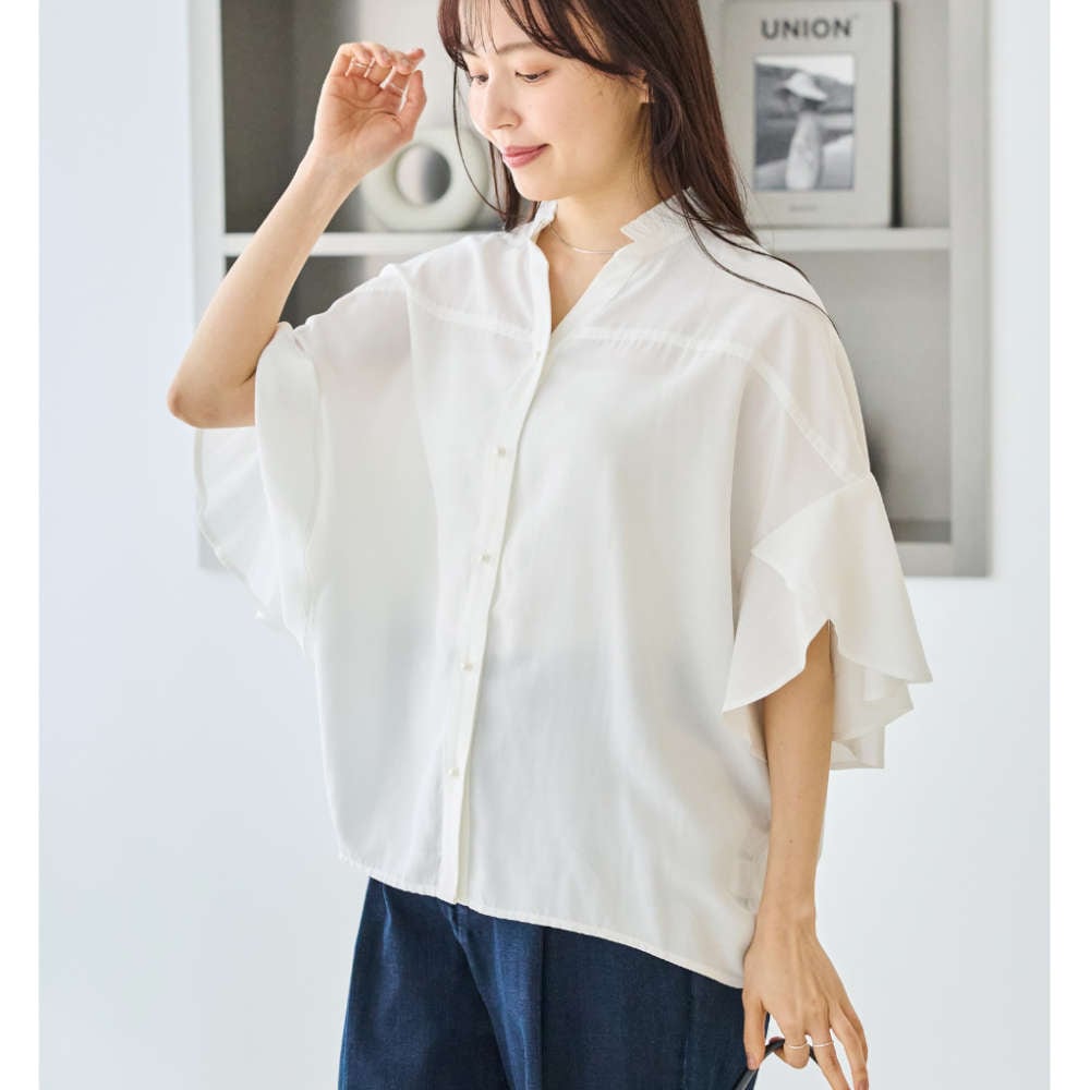 軽やかに揺れるフレアスリーブと、さりげない甘さを添えるフリル衿が印象的なスキッパーブラウス。