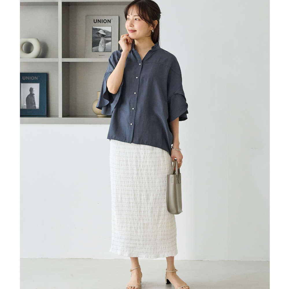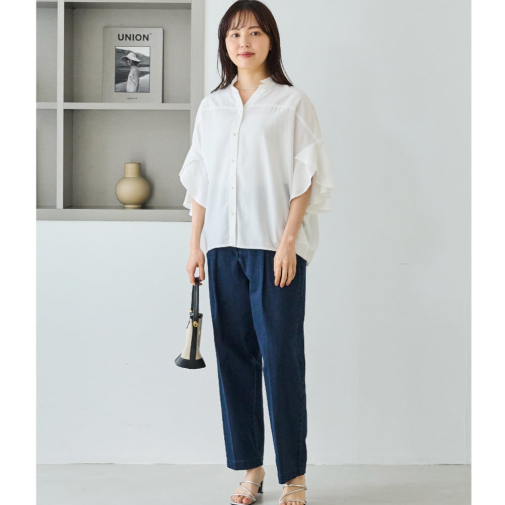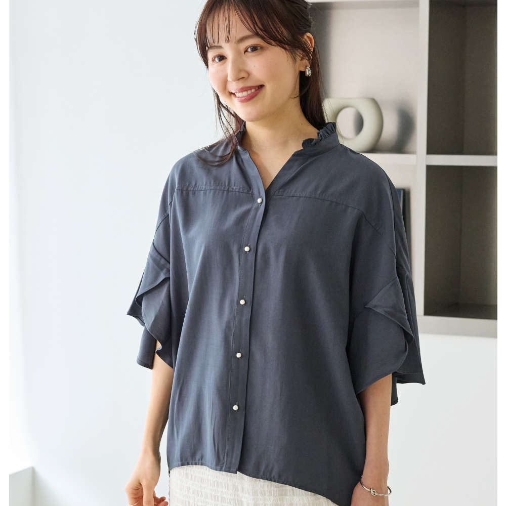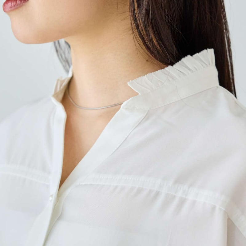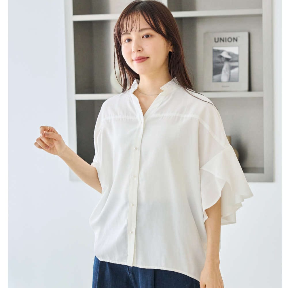 軽やかに揺れるフレアスリーブと、さりげない甘さを添えるフリル衿が印象的なスキッパーブラウス。