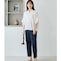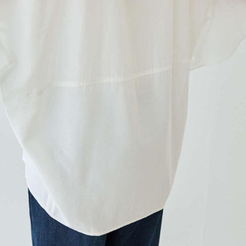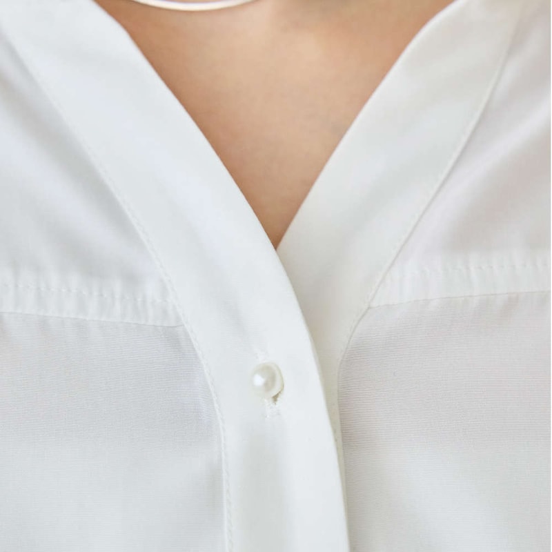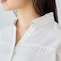 顔まわりをすっきり見せるスキッパーデザインに、上品なパール釦をあしらい、大人フェミニンな雰囲気に仕上げました。