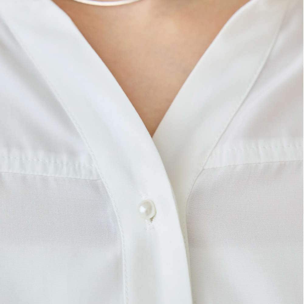 華やかなパールボタンが特徴のブラウス
