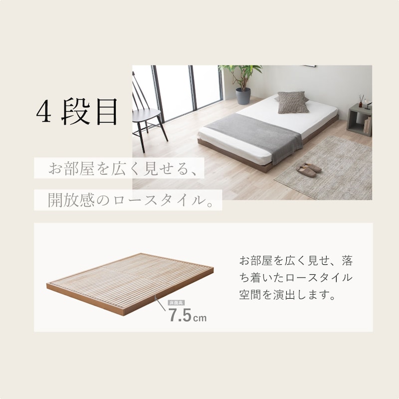●継脚仕様でフロアベッドから脚下に収納ケースが置ける高さまで、使い方に合わせて4段階で高さ調節が可能。