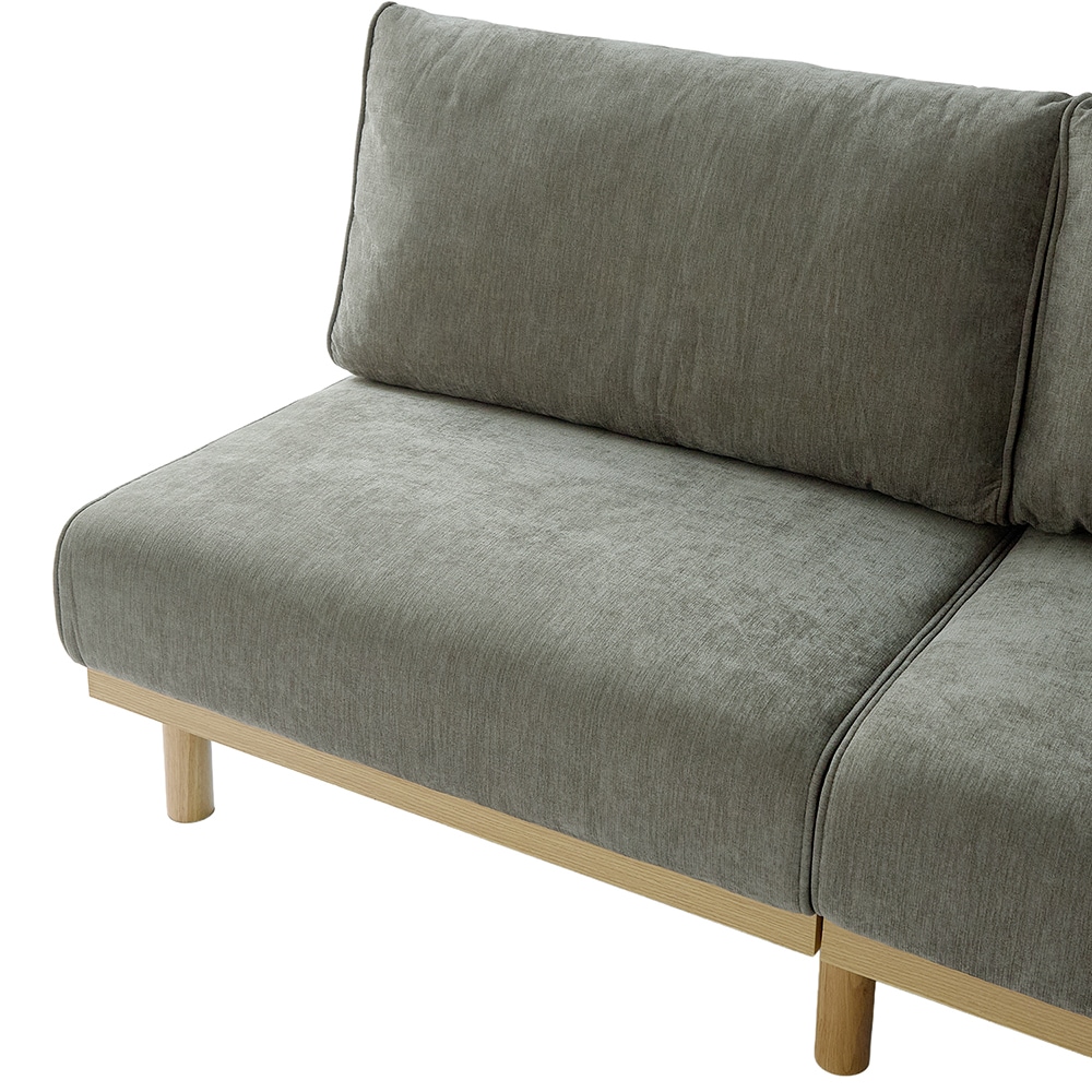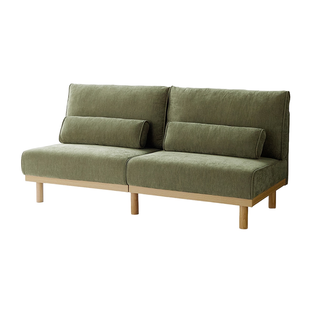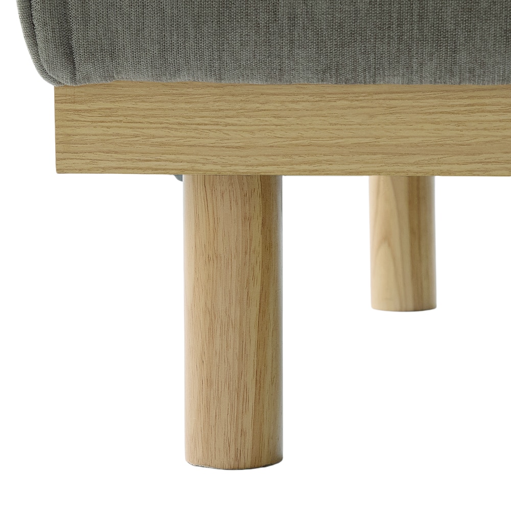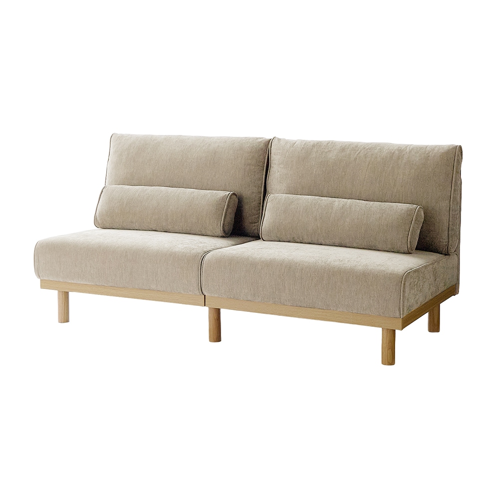 ●天然木の丸脚と木飾りがナチュラルで落ち着いた印象のファブリックソファー