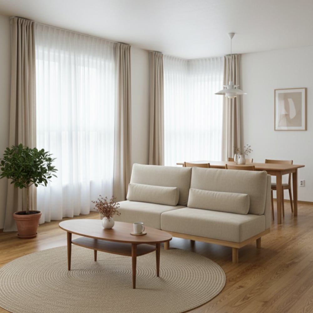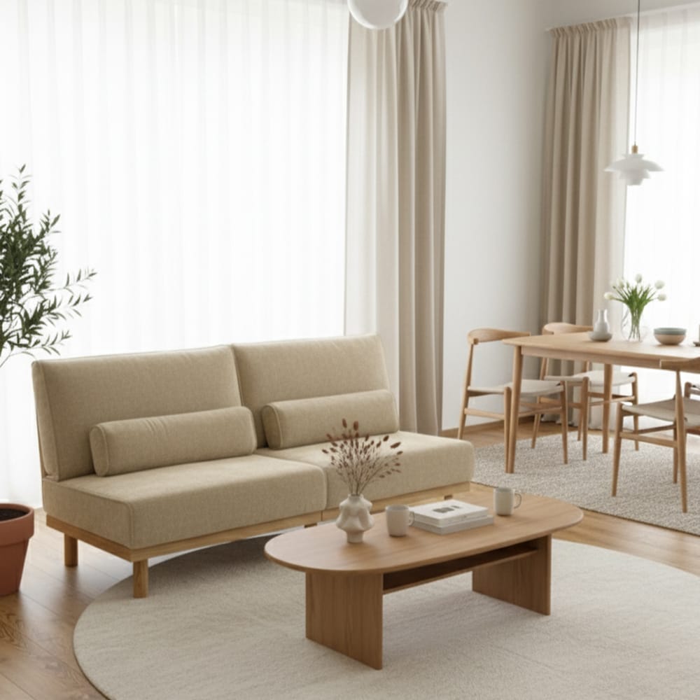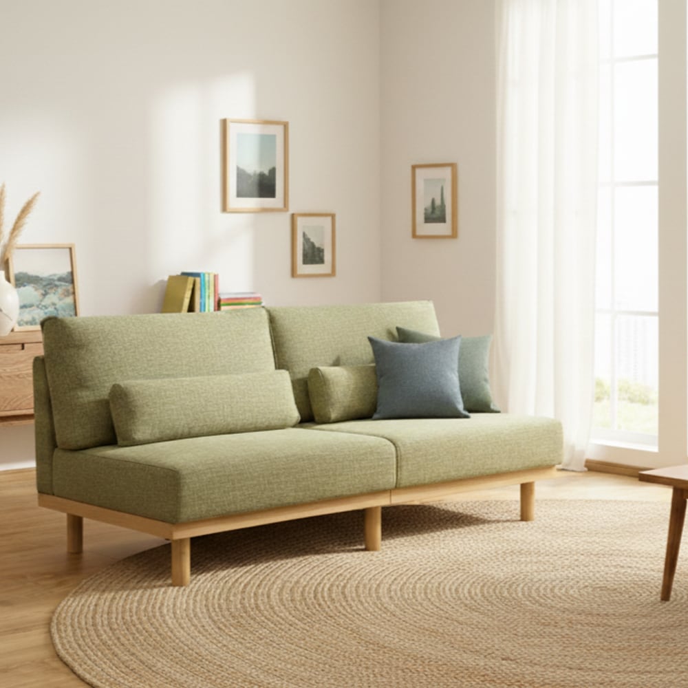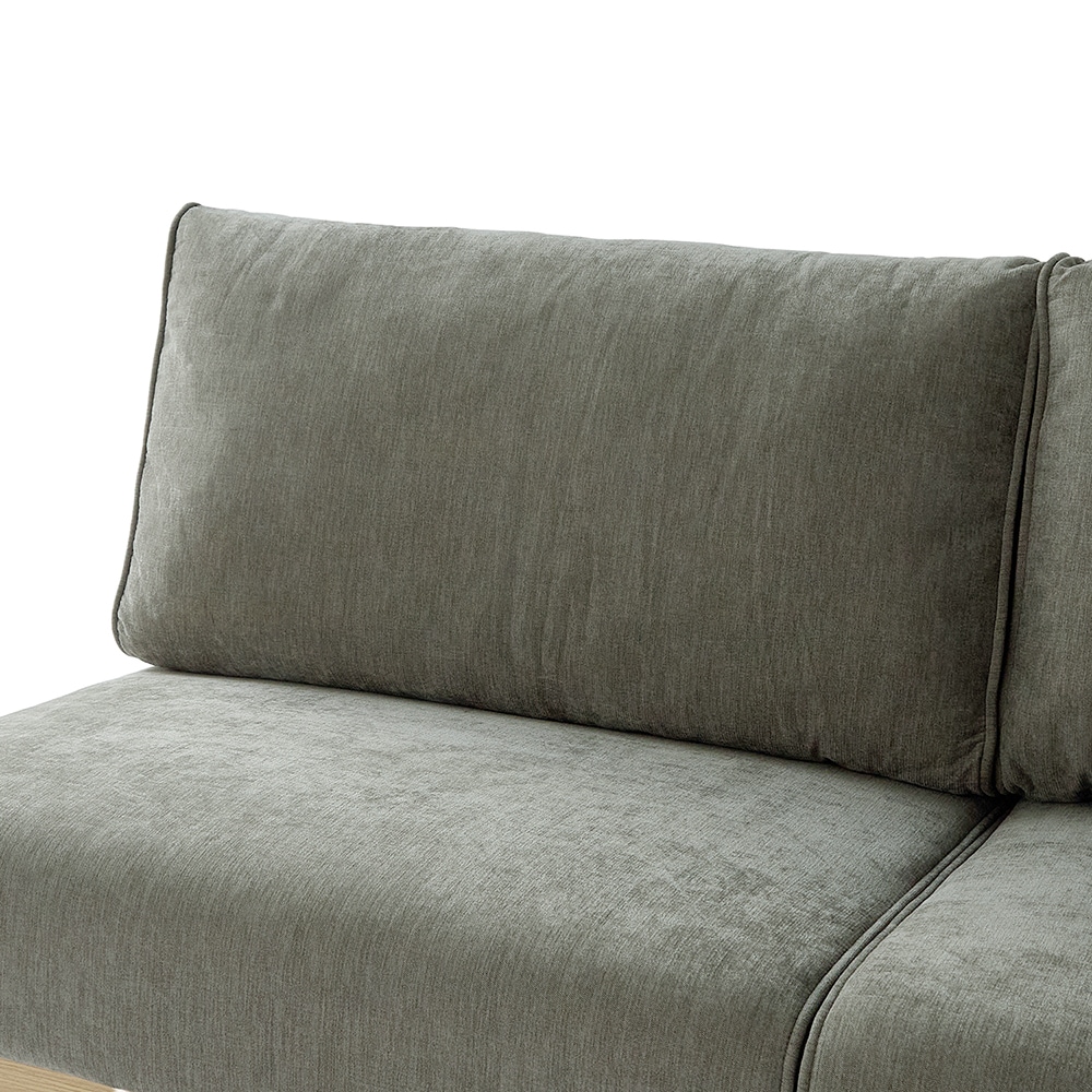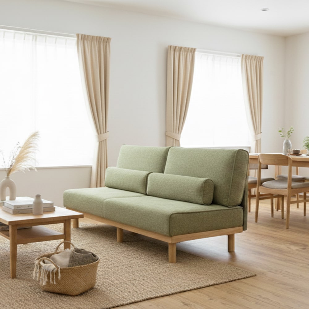 ●天然木の丸脚と木飾りがナチュラルで落ち着いた印象のファブリックソファー