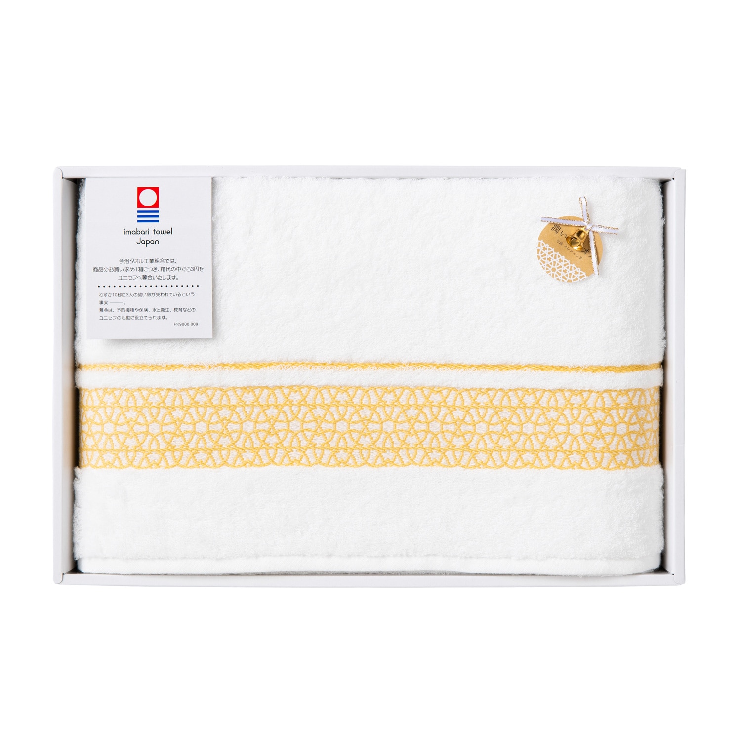 吉祥文様をモダンにデザインし、現代のライフスタイルに合わせやすい色と柄にアレンジしました。正統派のギフトにふさわしい、格調高い一品です。しっとりやわらかな肌ざわりと、洗うほどふっくらやわらかくなるタオルです。