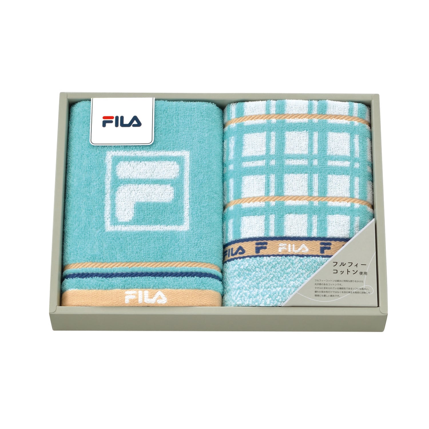 スポーツブランドらしい爽やかなブルーグリーンに、ベージュの差し色を入れて軽やかな印象のタオルギフト。使う方の心を華やかに彩ります。