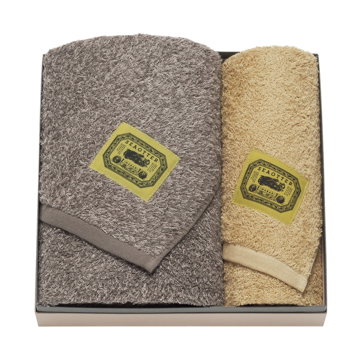 丁寧な子育てをすることで有名なラッコ。その愛くるしい子育てのシーンをロゴマークに掲げ、今治製の上質なタオルに仕立てました。高級感のある貼り箱はリユーサブルなデザインで、ギフトに最適です。