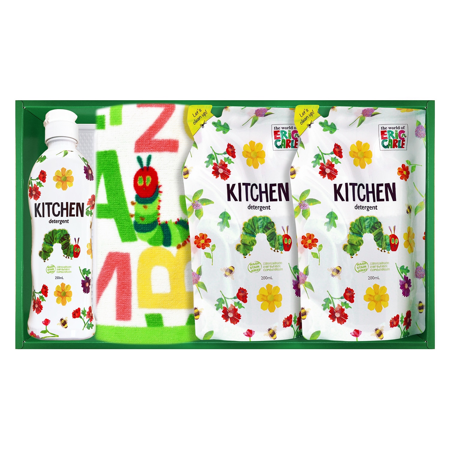 清潔感溢れるデザインが心地よい「はらぺこあおむし」のキッチン洗剤セットです。