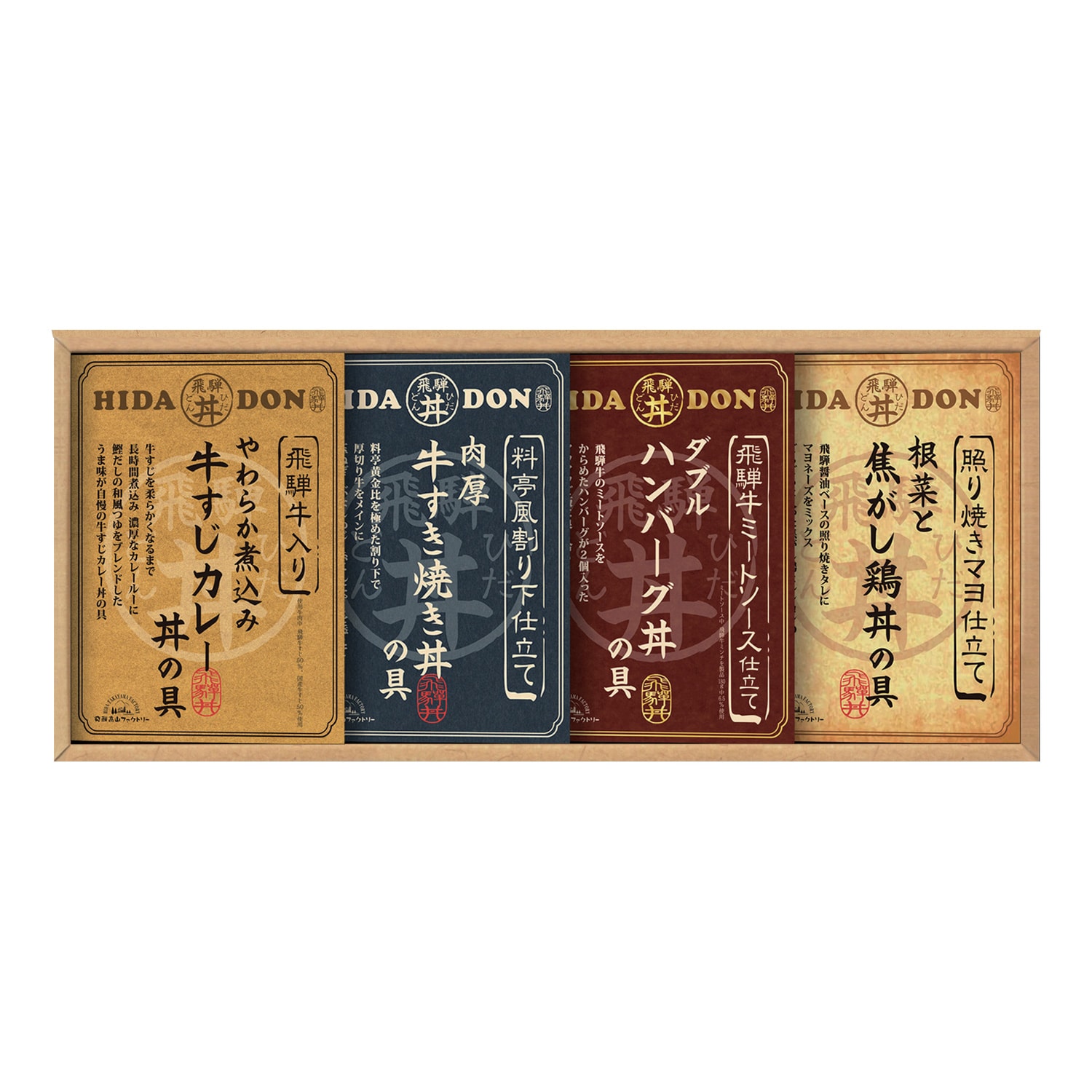 ●セット内容/飛騨牛仕込み牛すじカレー丼の具(180g)、飛騨牛ミートソース仕立てダブルハンバーグ丼の具(180g、固形量95g)、料亭風割り下仕立て牛すき焼き丼の具(170g)、照り焼きマヨ仕立て根菜と焦がし鶏丼の具(160g)