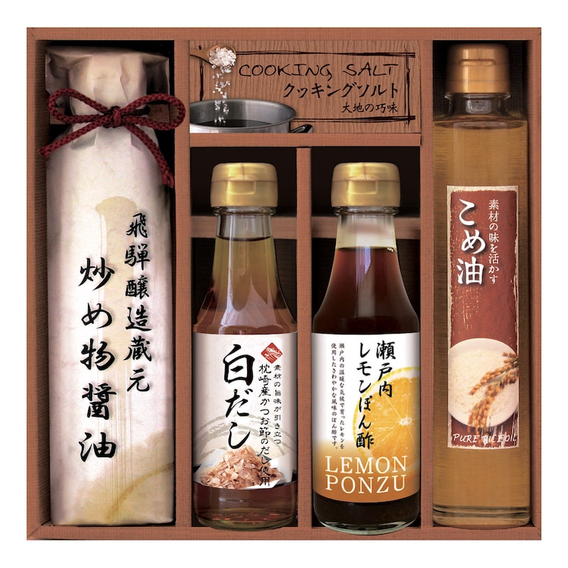 白だし、油、ぽん酢など、毎日の食卓に欠かせない調味料。そんな基本の調味料をセレクトしたギフトセットです。炒め物醤油は炒め物にピッタリで、これ一本で味が決まると人気のお醤油です。