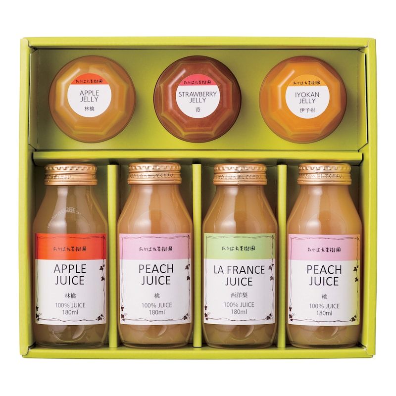 ●セット内容/ももジュース(180ml)×2、りんごジュース、ラ・フランスジュース(各180ml)、いちごゼリー、りんごゼリー、伊予柑ゼリー(各120g)