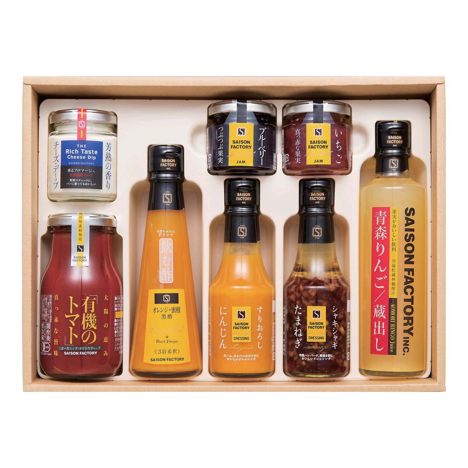 ●セット内容/有機のトマトケチャップ(300g)、りんごジュース(270g)、チーズディップ(80g)、リッチスタイルジャムいちご(70g)、リッチスタイルジャムブルーベリー(65g)、飲む酢オレンジ+蜜柑黒酢(160ml)、リッチスタイルドレッシング(にんじん、たまねぎ)(各140ml)