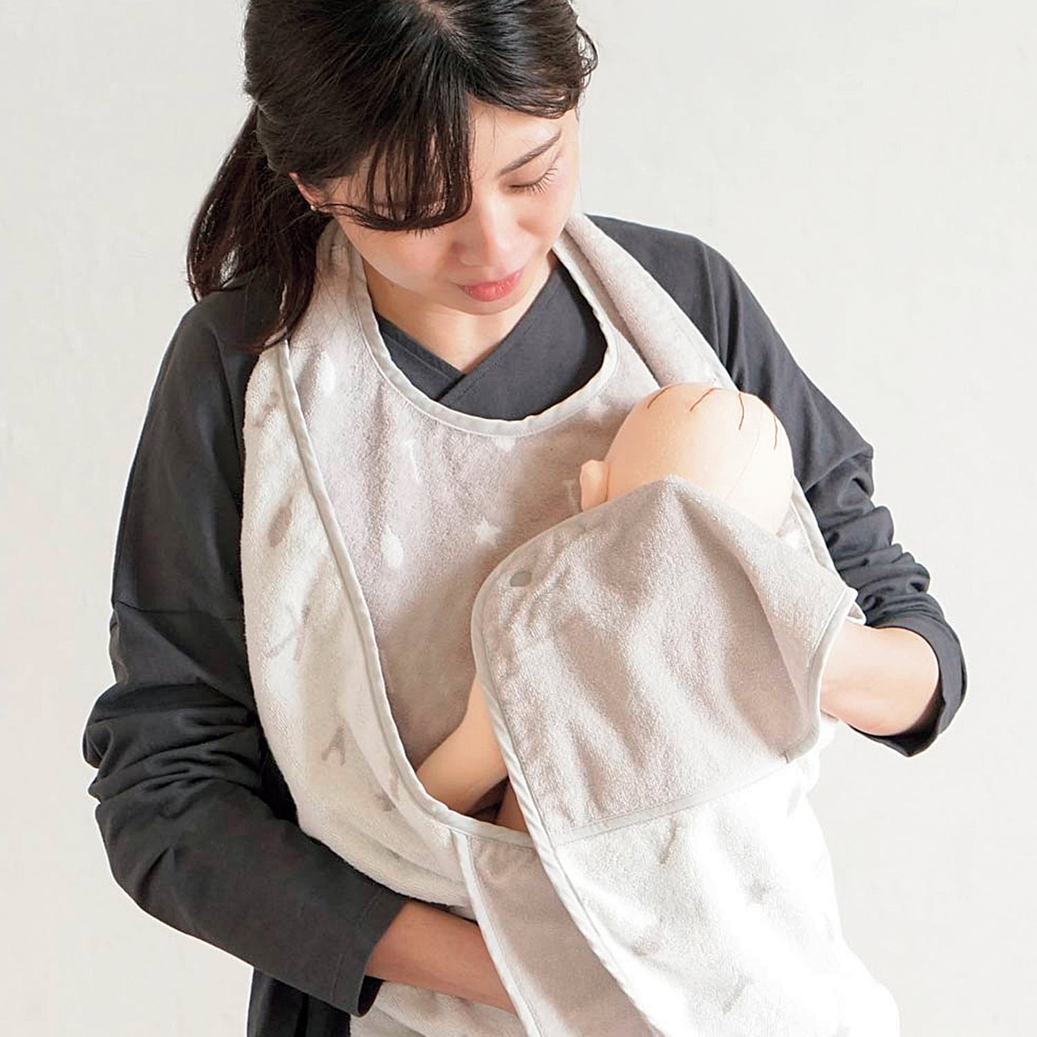 湯あがりの赤ちゃんをだっこしたまま拭けるエプロン型のバスタオル