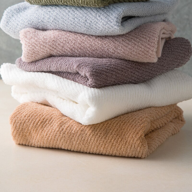リラックスしたおうち時間を楽しむためのタオル「RELA home 」。高密度のパイル素材、斜めに走った織りライン、スモーキーなニュアンスカラーの色展開。今治タオルの高い品質と技術力で、細部までこだわった理想のタオルが生まれました。