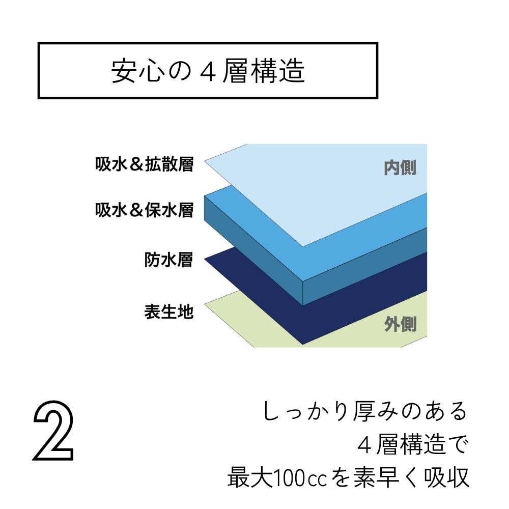 ●吸水シートは厚みのある「4層構造」を採用。最大約100ccの尿漏れを素早く吸収