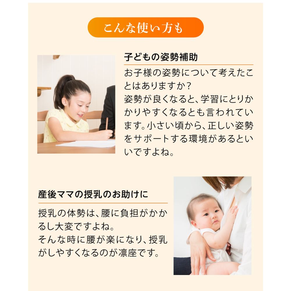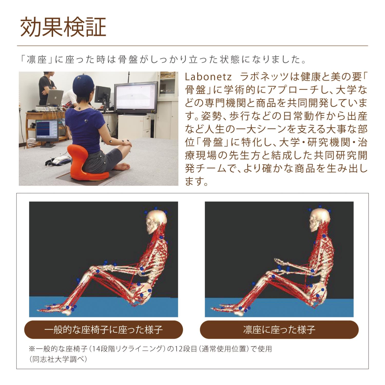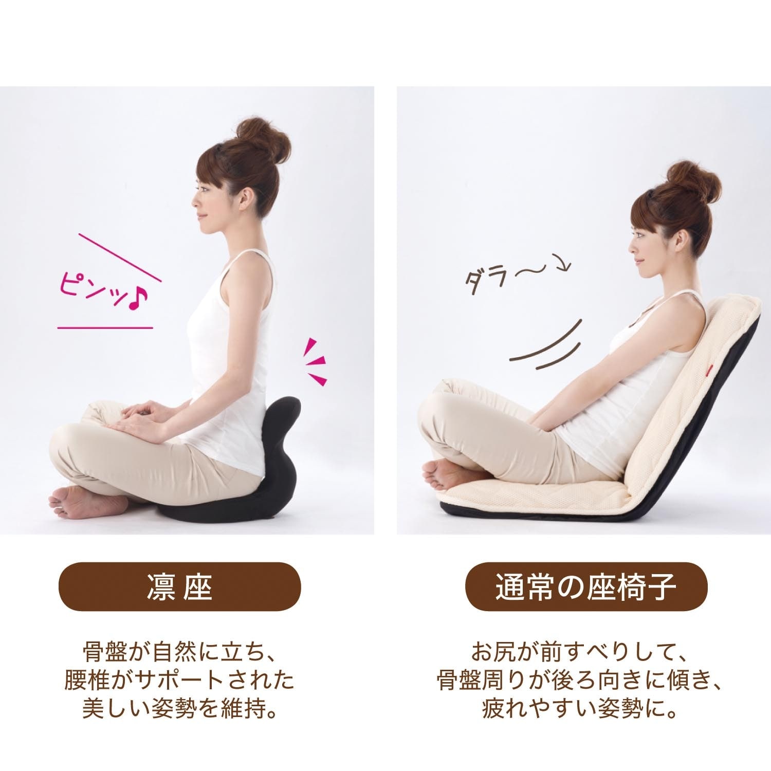 「凛座」は、腰椎や骨盤周りをピンポイントで支え、腰・背中が凛と伸びた美姿勢をサポートする座椅子です。