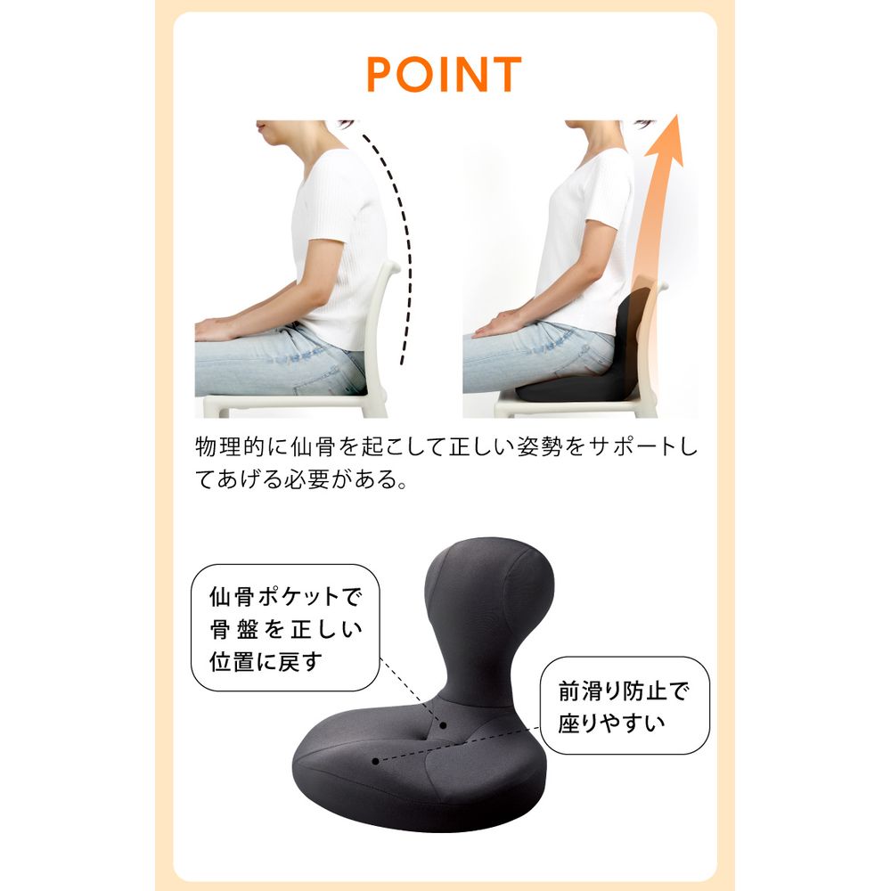 座面はおしりが前すべりしないように支える構造で、腰を背もたれに宛てて深く腰掛けるだけで美姿勢を実感できます。