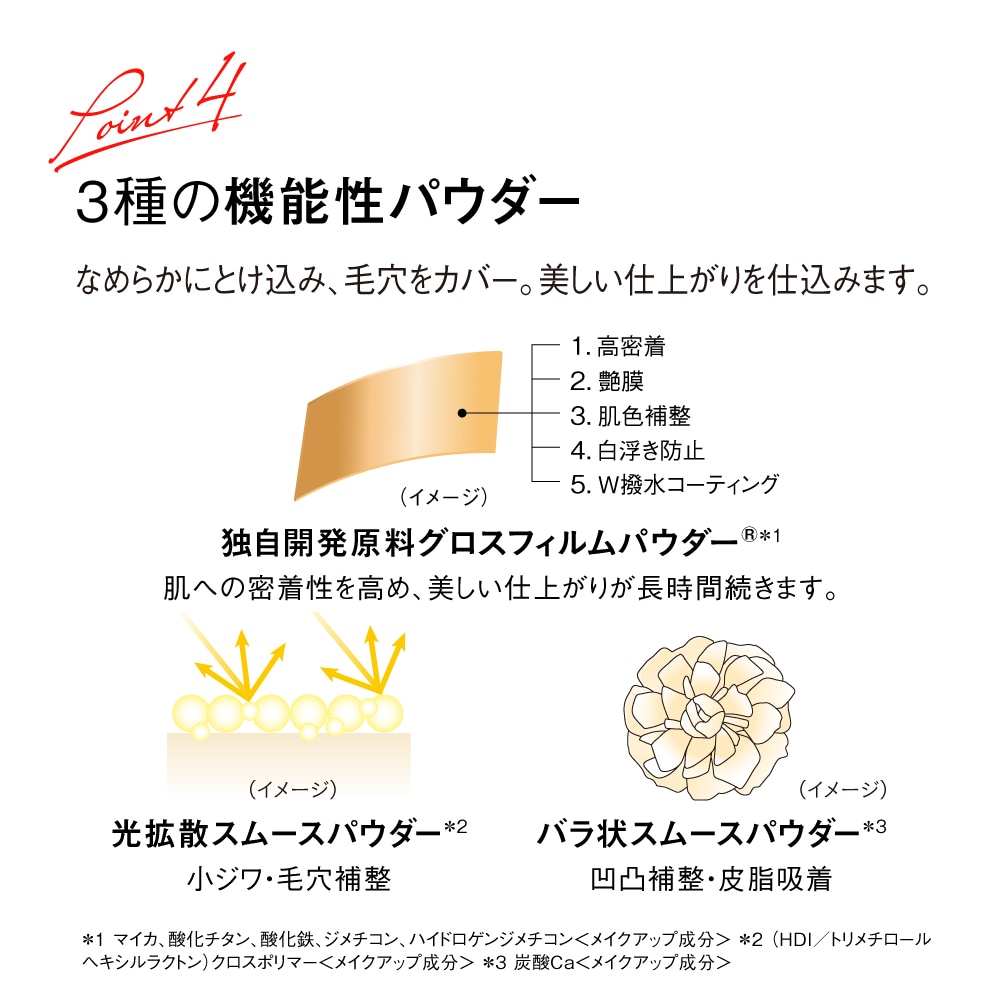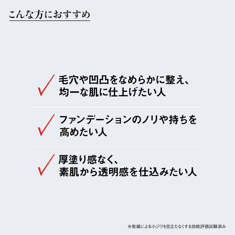 肌なじみのよいライトベージュの色味と超微細なパウダーで、毛穴やくすみを自然にカバーし、つるんと陶器のような肌を演出します。