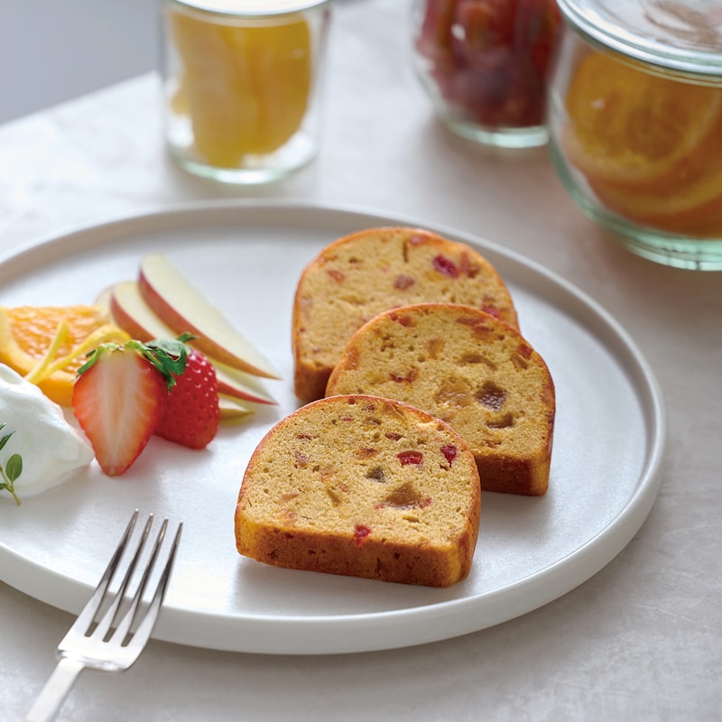 7種類のフルーツを洋酒に漬け込み、紅茶の生地でくるんだ、フルーツが詰まったパウンドケーキ。ひとくち食べ進めていくごとに、7種のフルーツそれぞれの味わいを楽しめる、ホテルシェフならではのデザートに仕上げました。