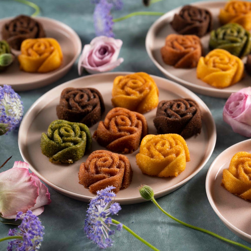 アーモンドプードルとバターを合わせた生地に色とりどりの素材を混ぜ込んでバラの型に流し込み、オーブンでふっくら香ばしく焼き上げました。