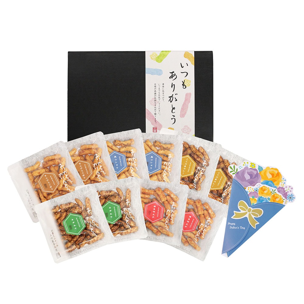 きんぴらごぼうやこくうまカレー、博多明太子など、バラエティ豊かな「おつまみ」かりんとうです。お酒のお供にもぴったりな「おつまみ」ギフト。「いつもありがとう」の気持ちが伝わる一品です。父の日のメッセージをつけてお届けいたします。