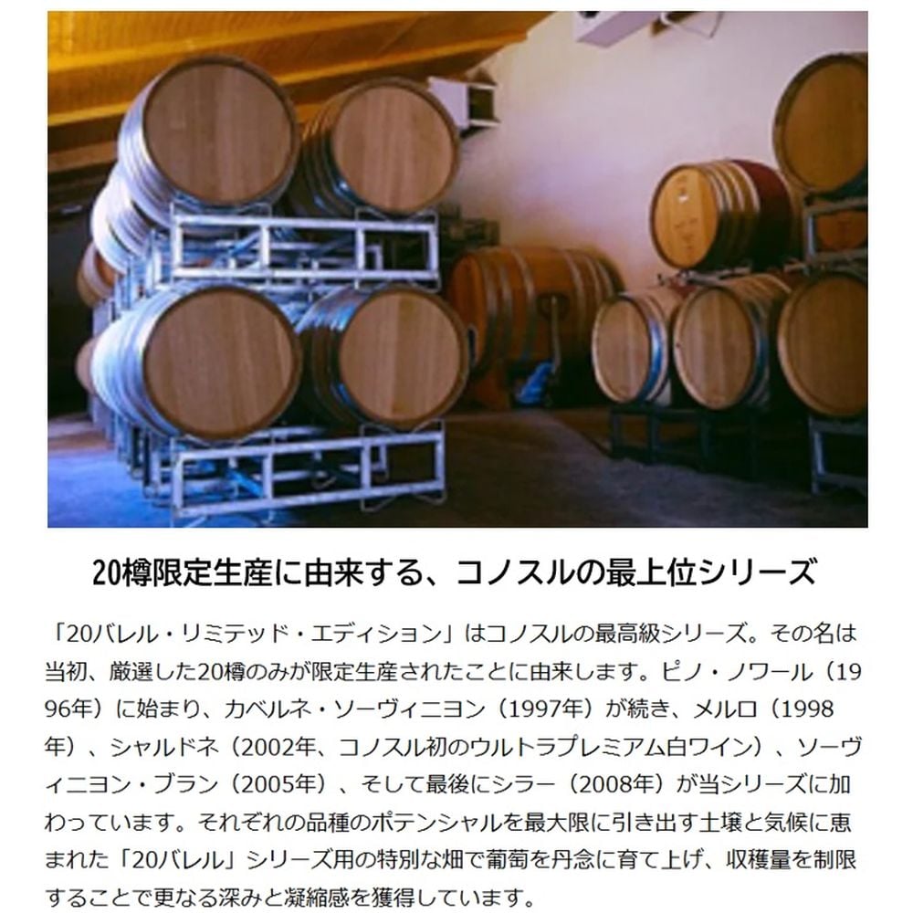 ●セット内容/コノスル 20バレル リミテッド・エディション 6品種(カベルネ・ソーヴィニヨン(750ml)、ピノ・ノワール(750ml)、シラー(750ml)、カルメネール(750ml)、シャルドネ(750ml)、ソーヴィニヨンブラン(750ml)):計6本