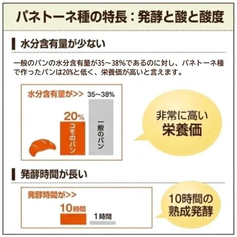 パネトーネ種に含まれる乳酸菌は、糖を発酵して乳酸やアルコール、酢酸、炭酸ガスを生成。生地のpHを低下させ汚染細菌の生育を防止するため、通常のパンの賞味期間が2~3日であるのに対し、60~90日という長期保存が可能となるのです。