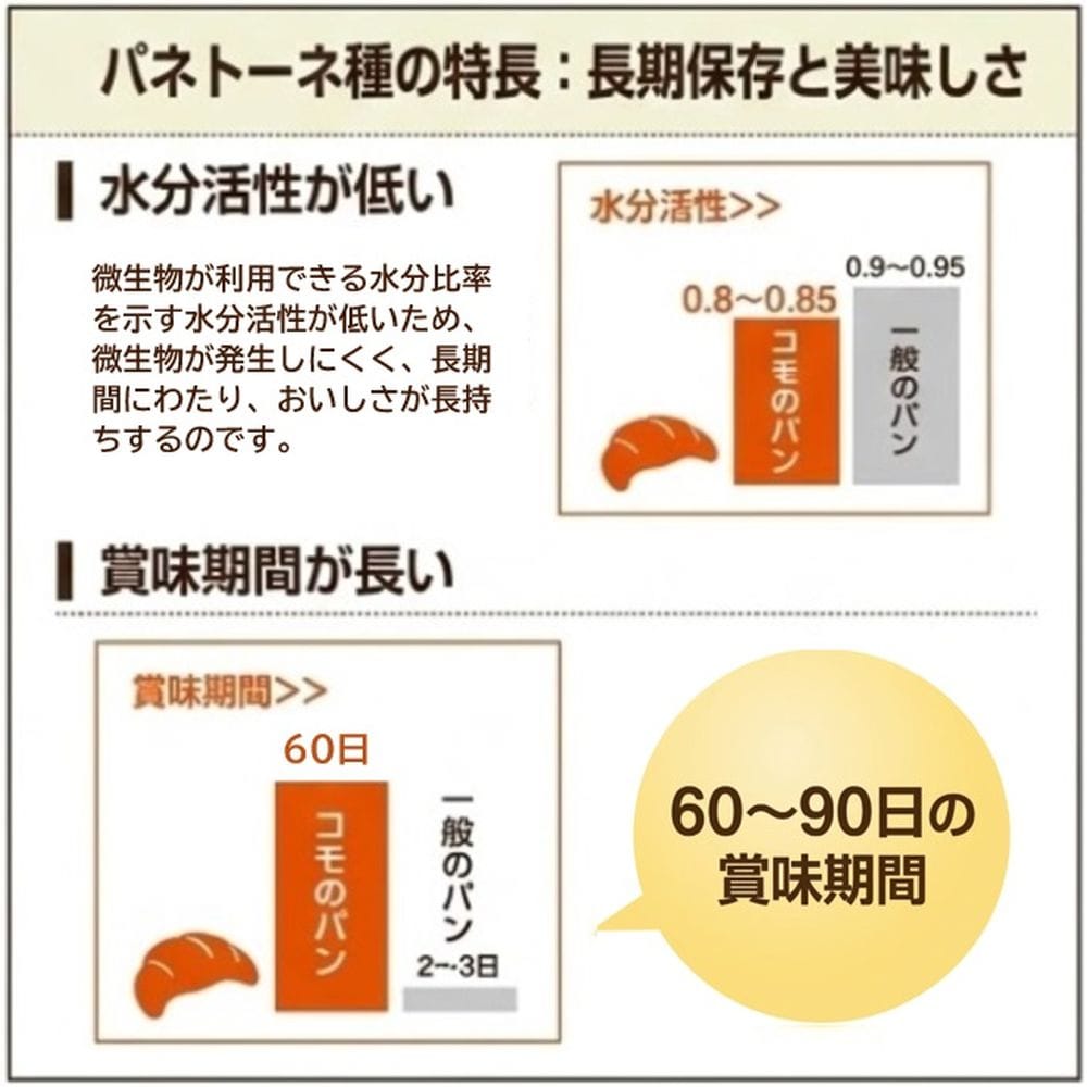 パネトーネ種に含まれる乳酸菌は、糖を発酵して乳酸やアルコール、酢酸、炭酸ガスを生成。生地のpHを低下させ汚染細菌の生育を防止するため、通常のパンの賞味期間が2~3日であるのに対し、60~90日という長期保存が可能となるのです。