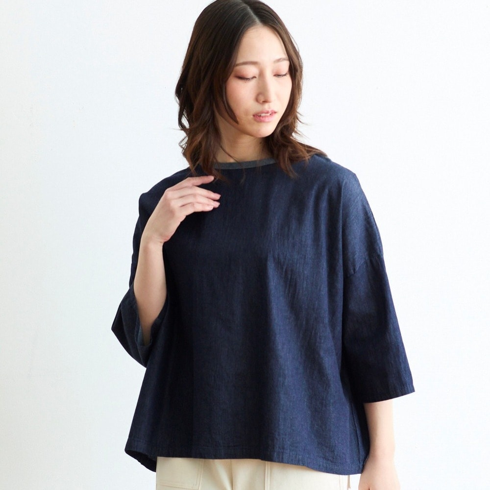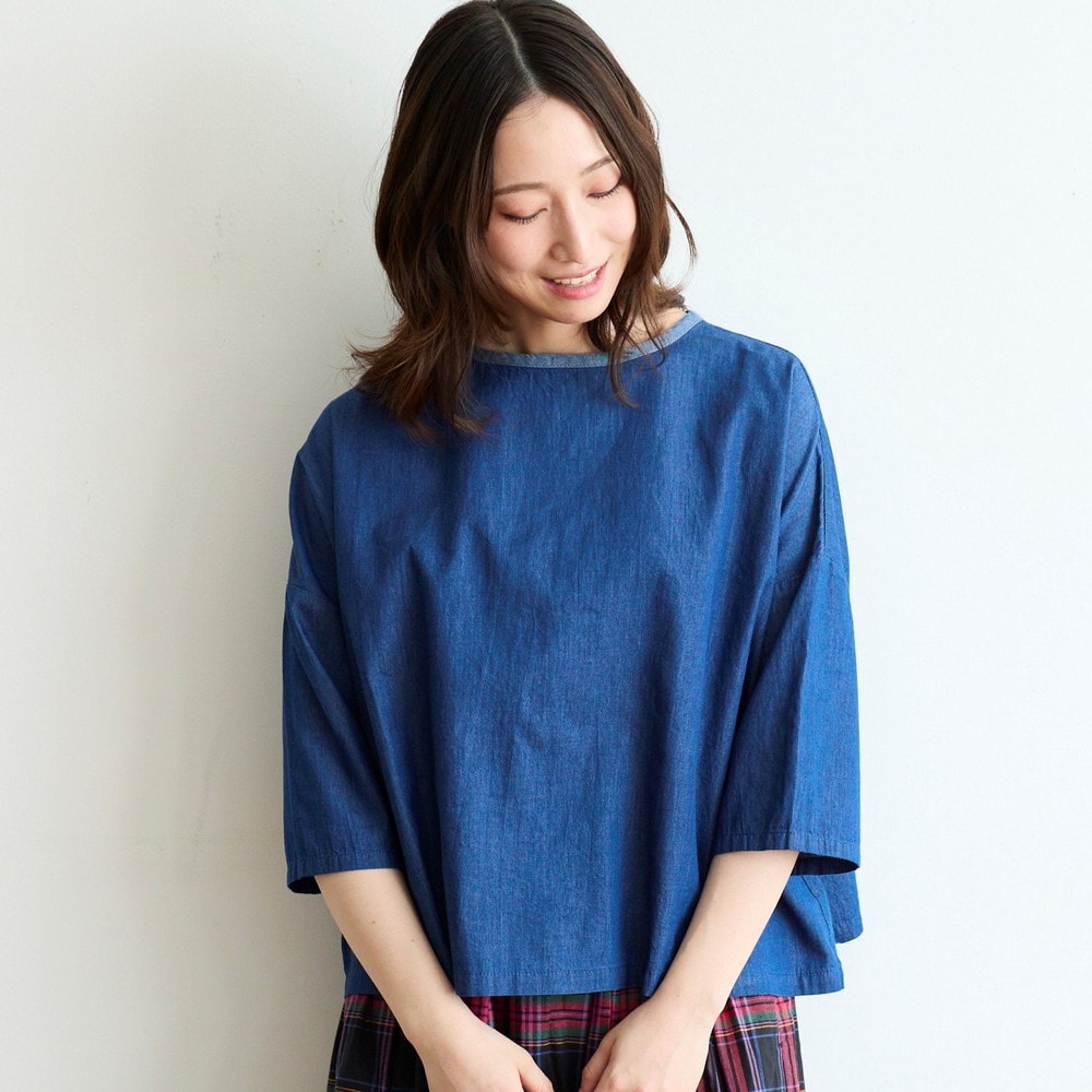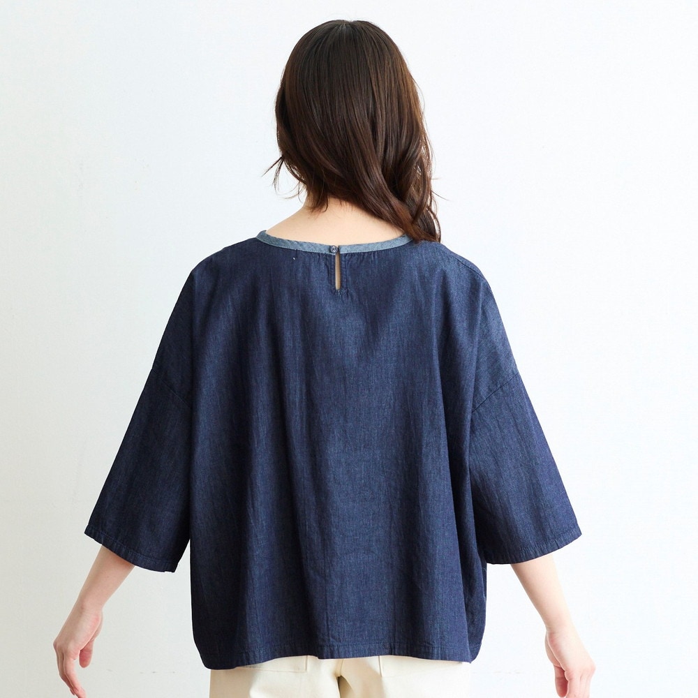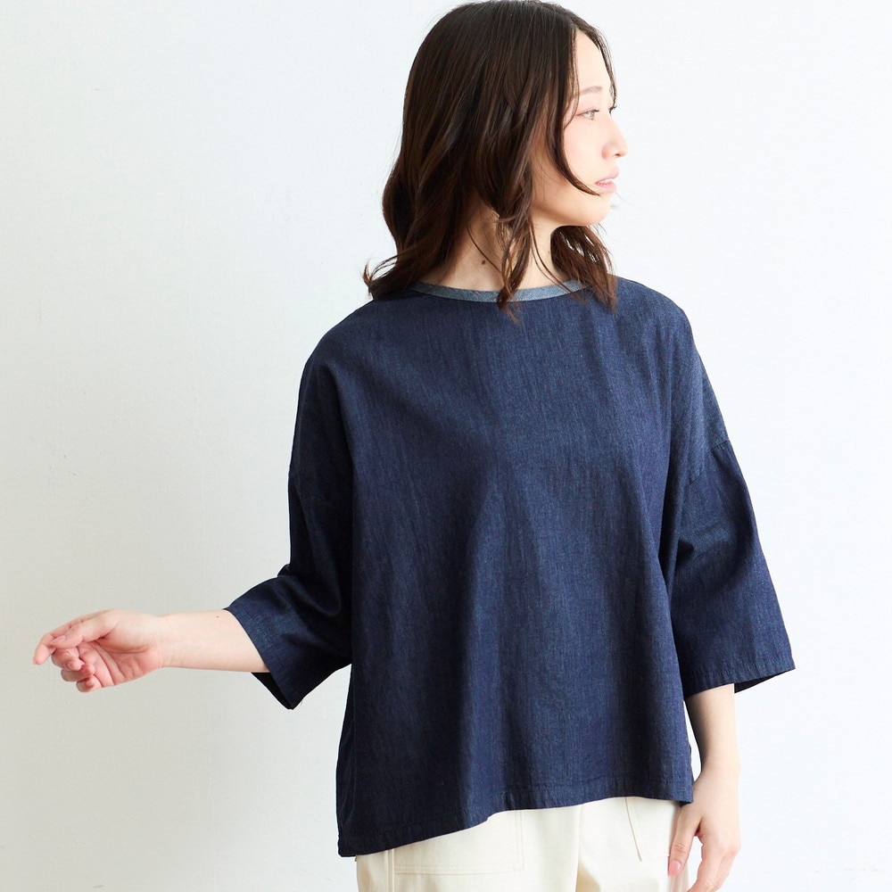 微配色のパイピングが映える薄手コットンデニムの7分袖ブラウス