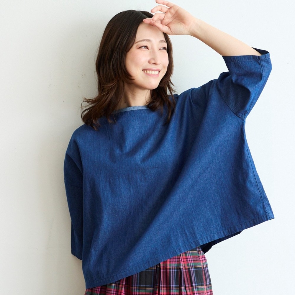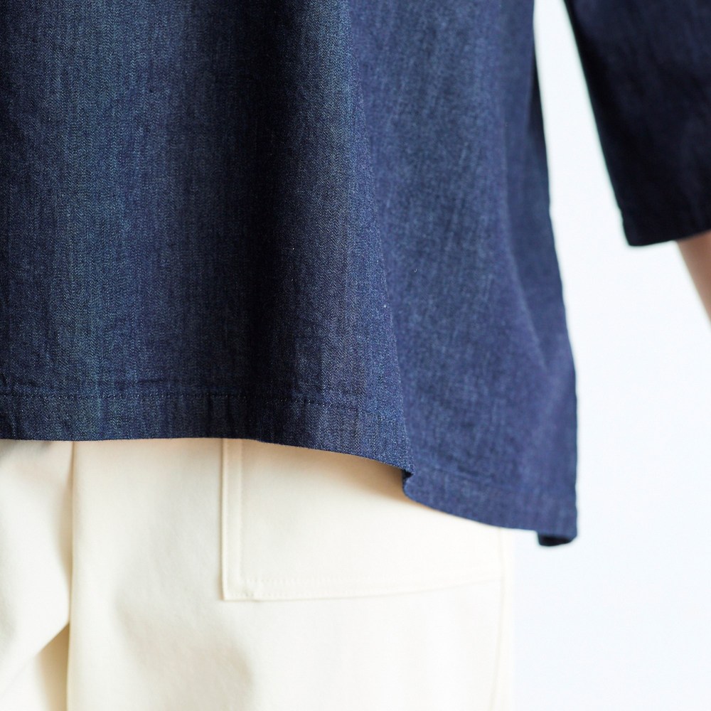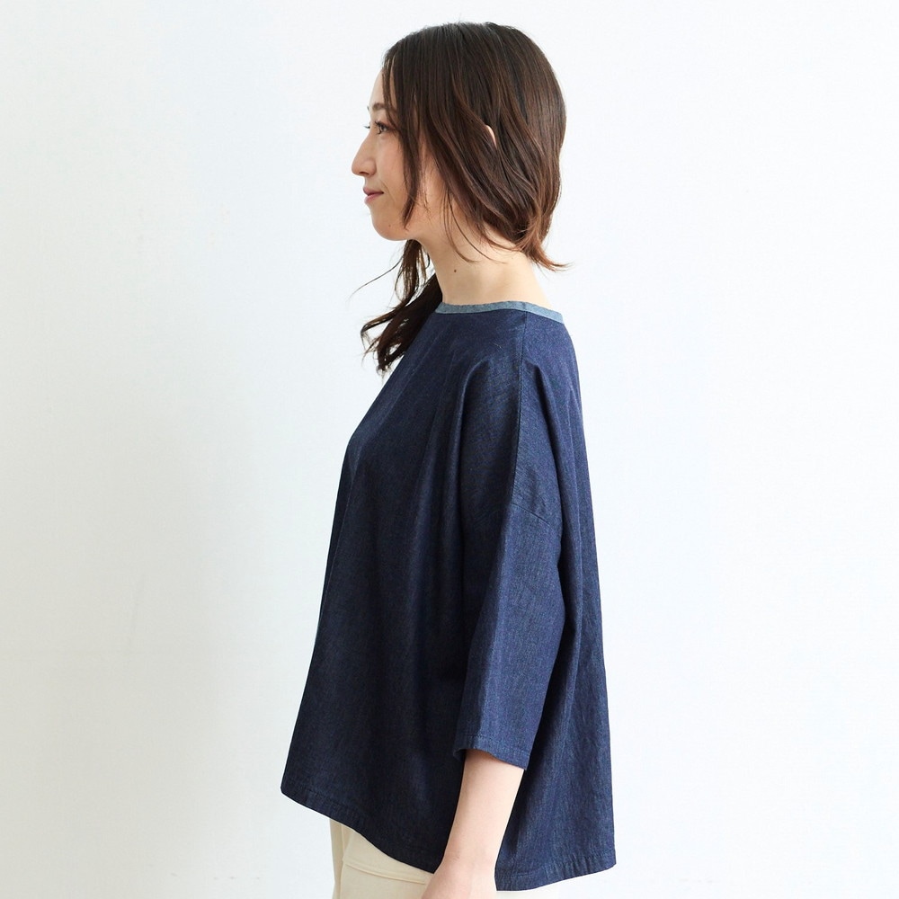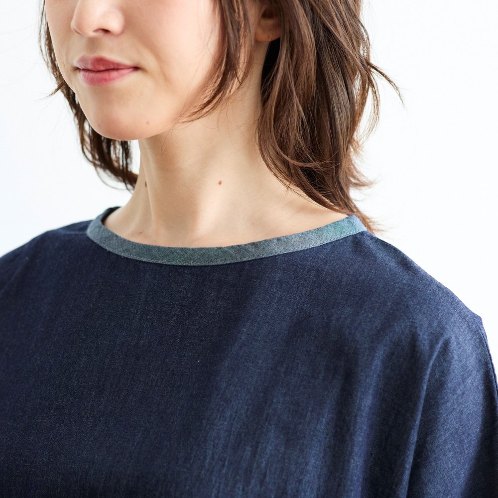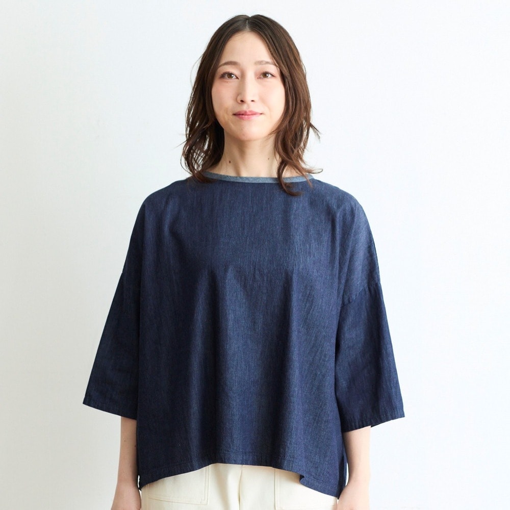 微配色のパイピングが映える薄手コットンデニムの7分袖ブラウス