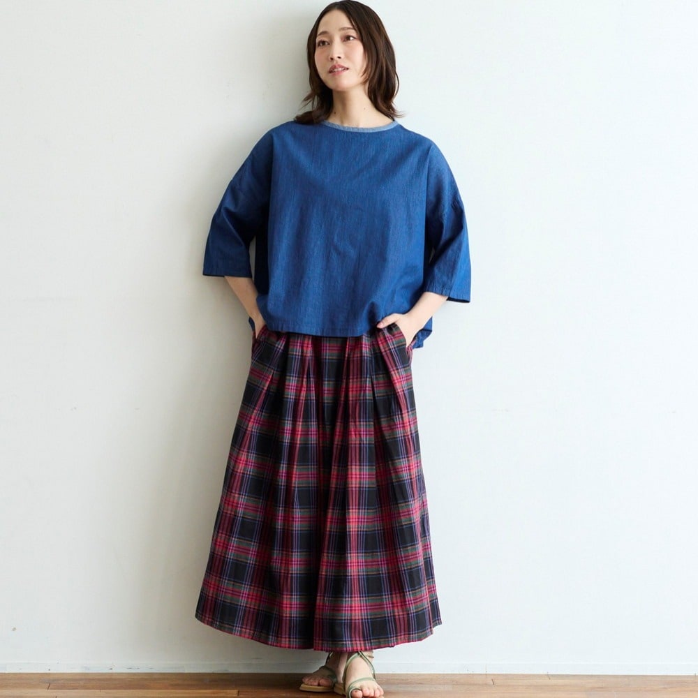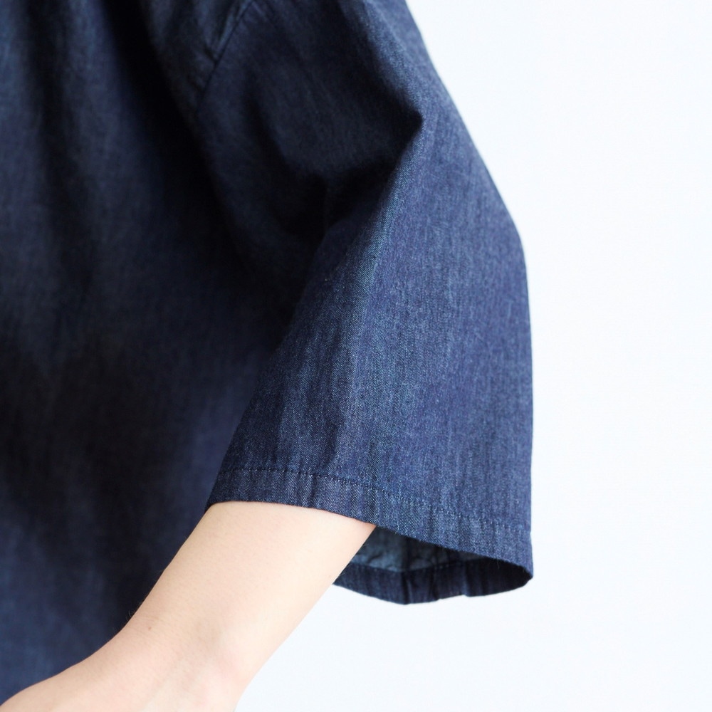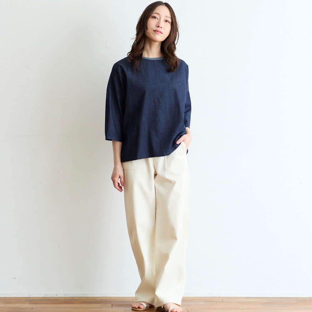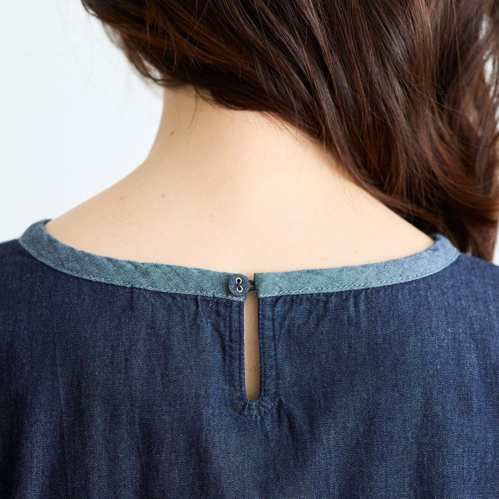 微配色のパイピングが映える薄手コットンデニムの7分袖ブラウス