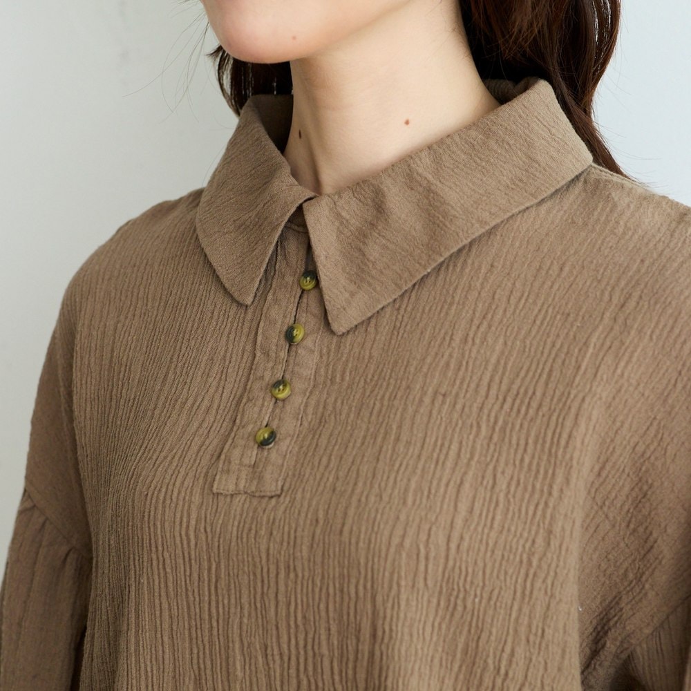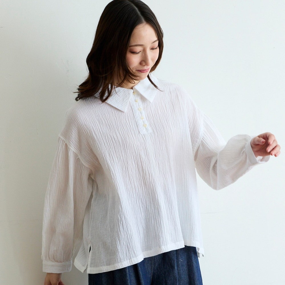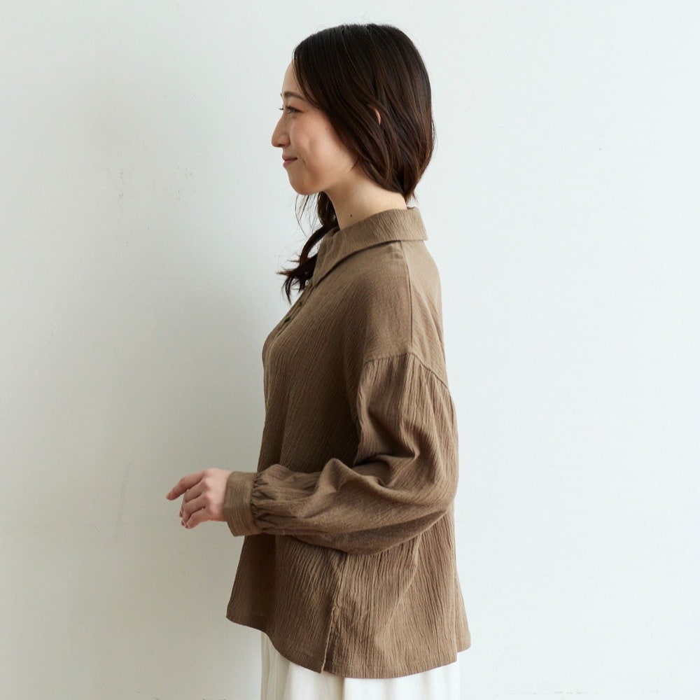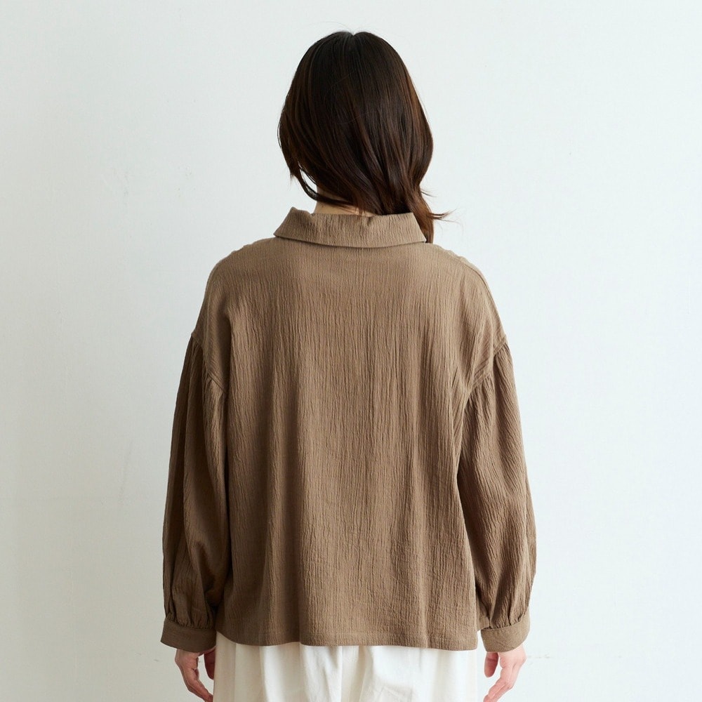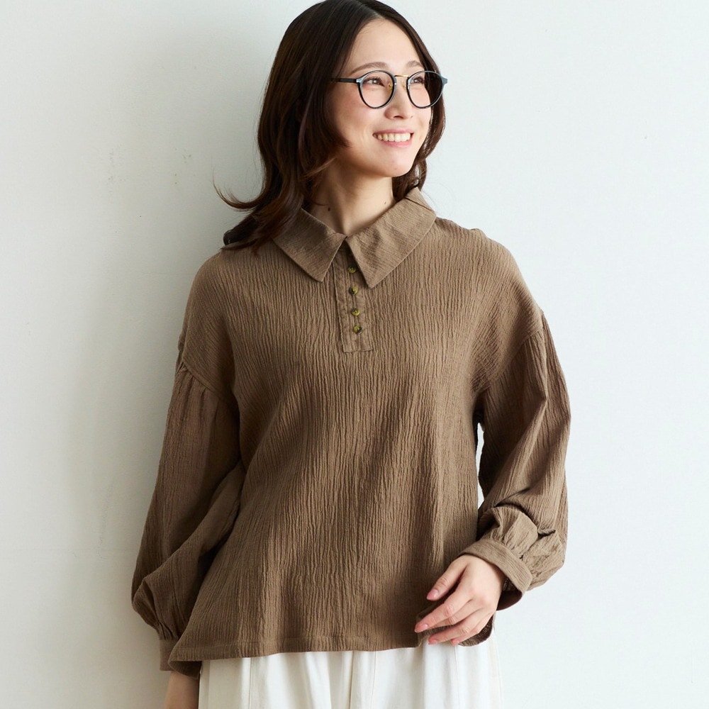 大きめカラーとシボ感が目を引く綿麻の楊柳ブラウス