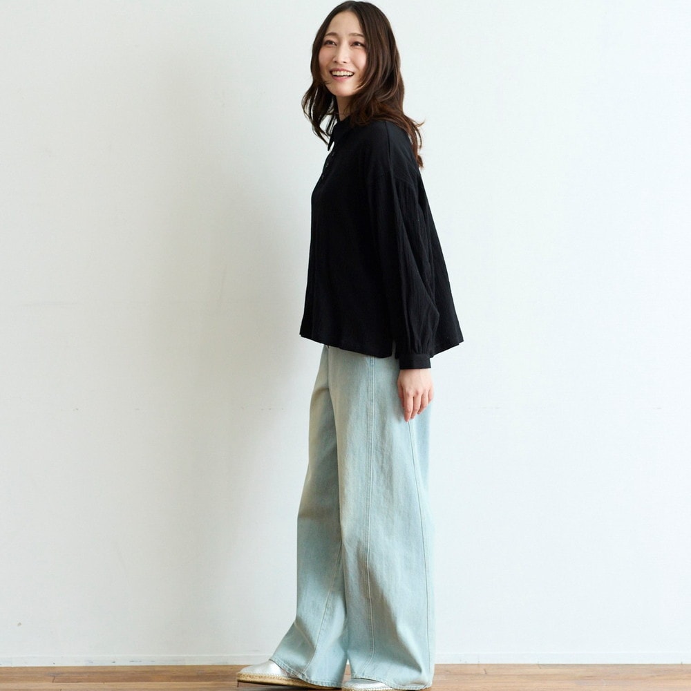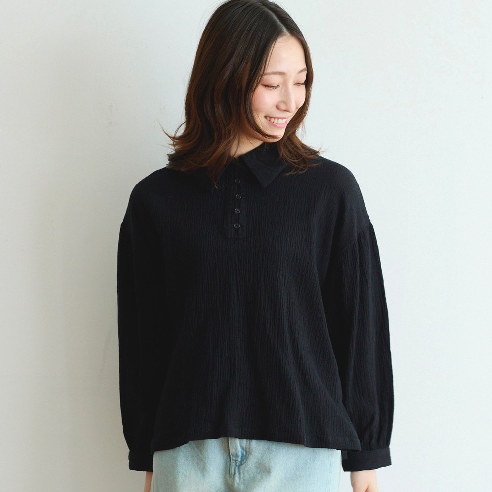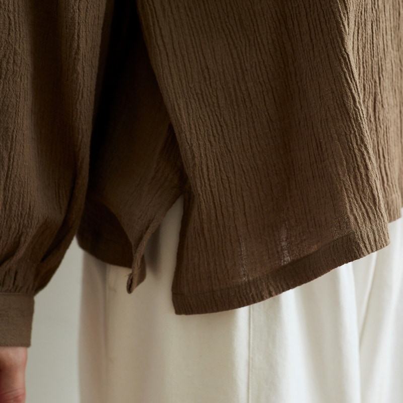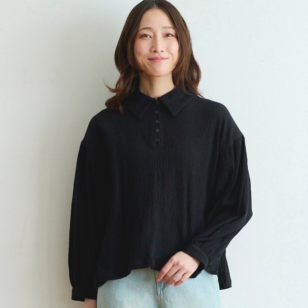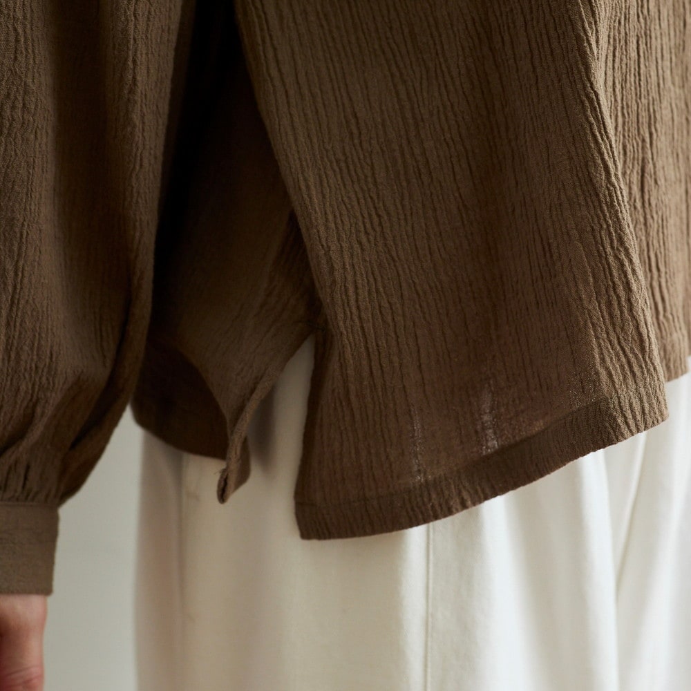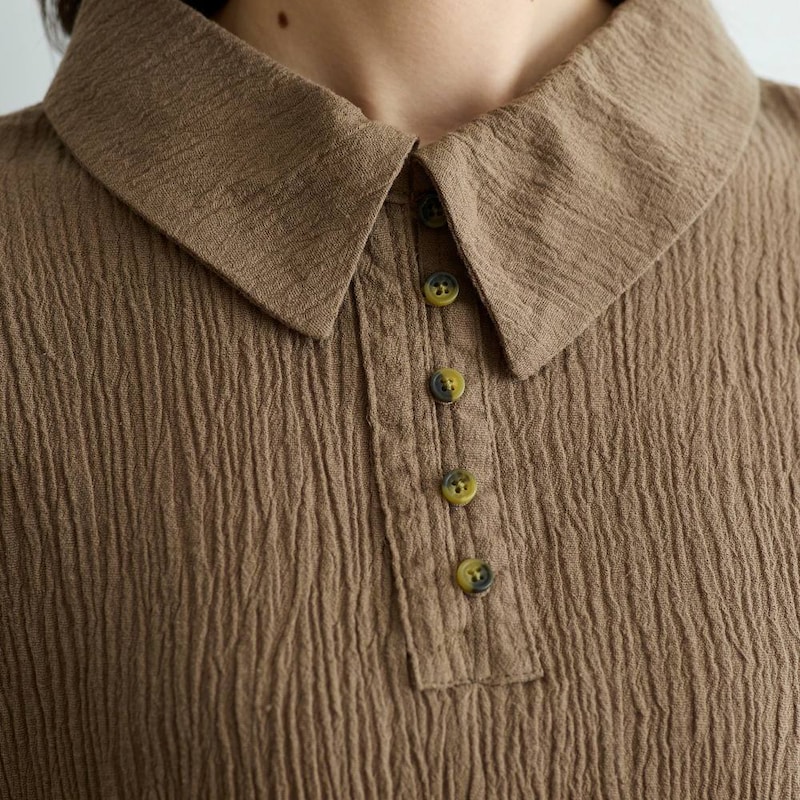 大きめカラーとシボ感が目を引く綿麻の楊柳ブラウス