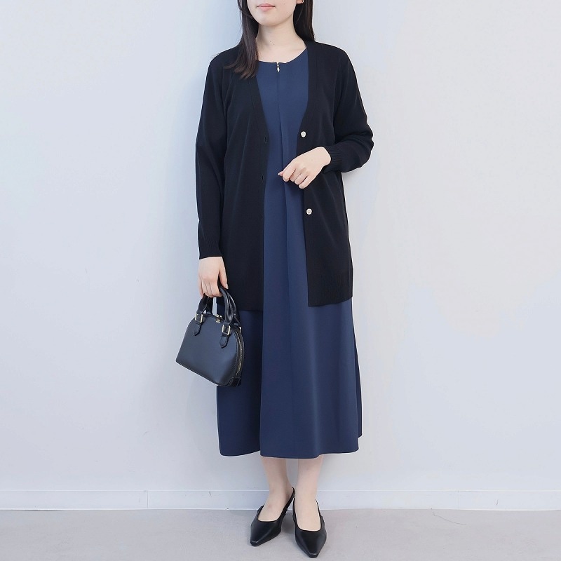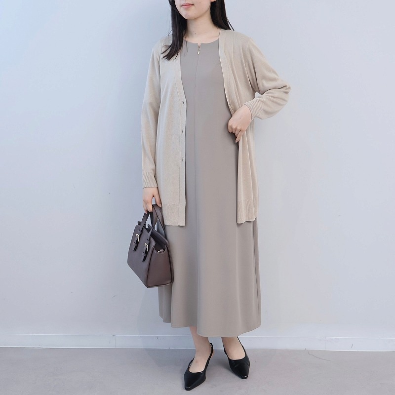 ショート丈カーディガンを羽織って頂くと、5分袖とのバランスが良く温度調整が必要な時にも上品に対応できる着回しが可能です。