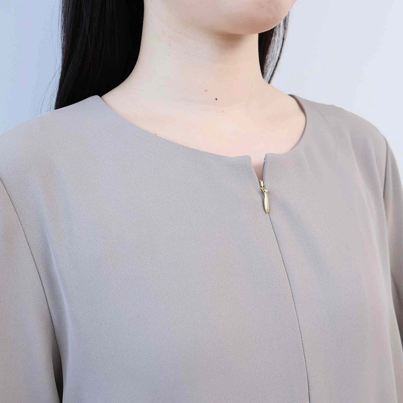 1枚で着用いただくと、5分袖丈なのでカーディガンなしでも上品に決まり、フロントのゴールドジップがアクセサリー代わりになります。