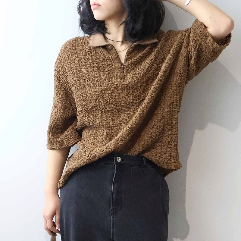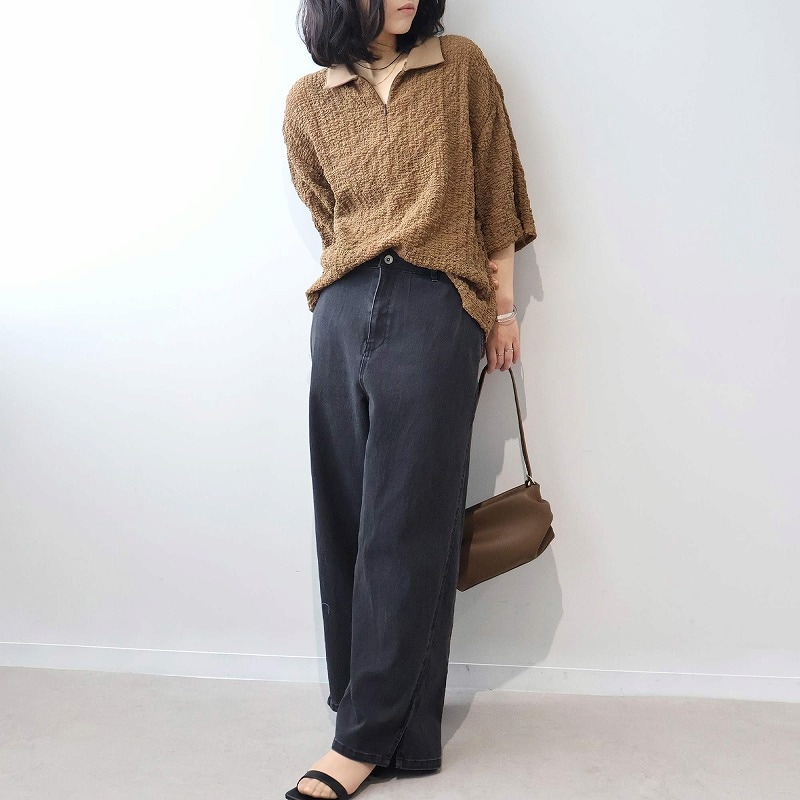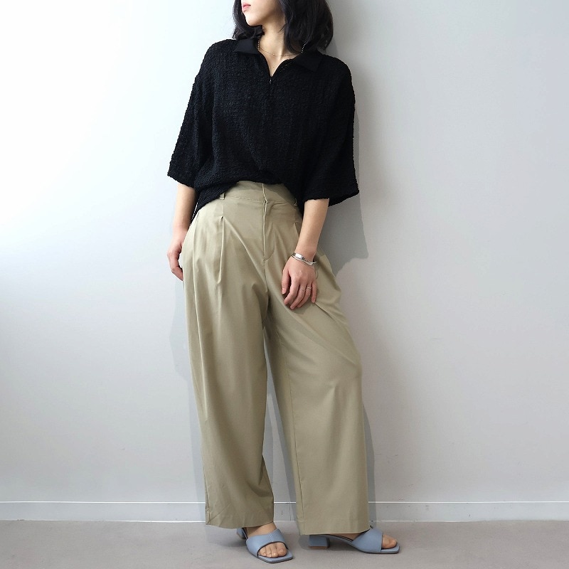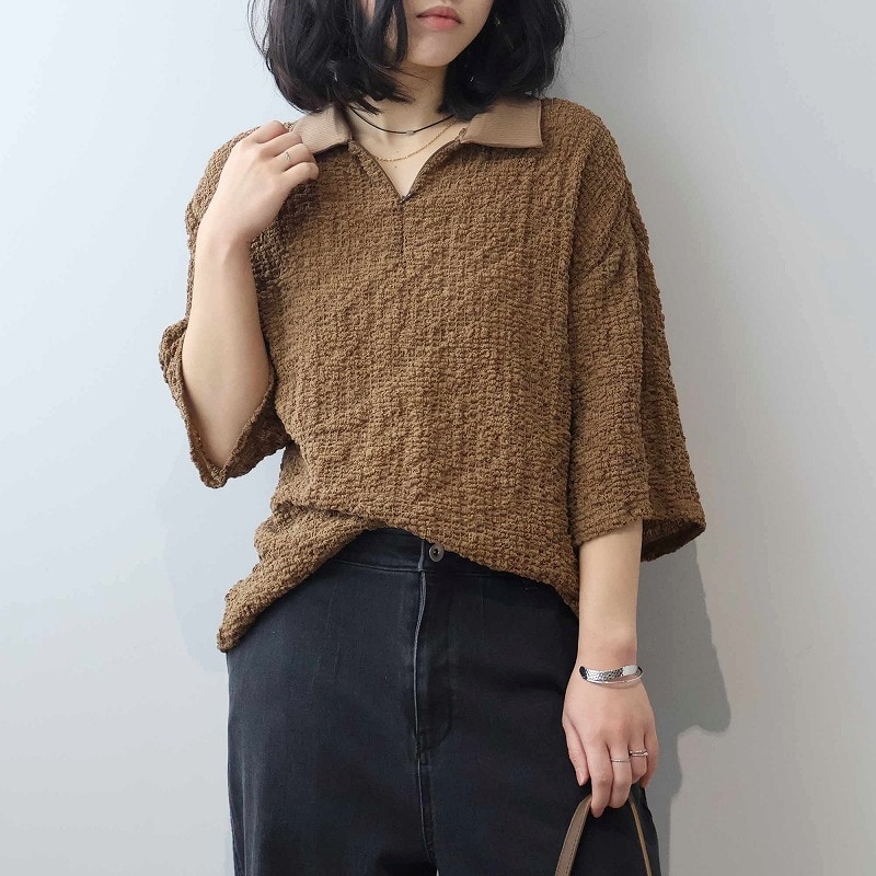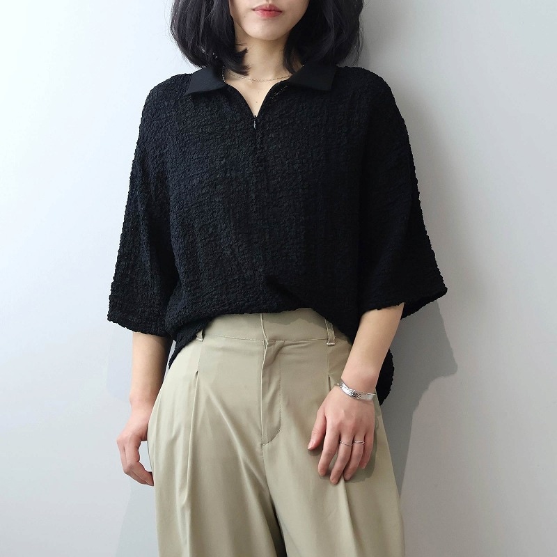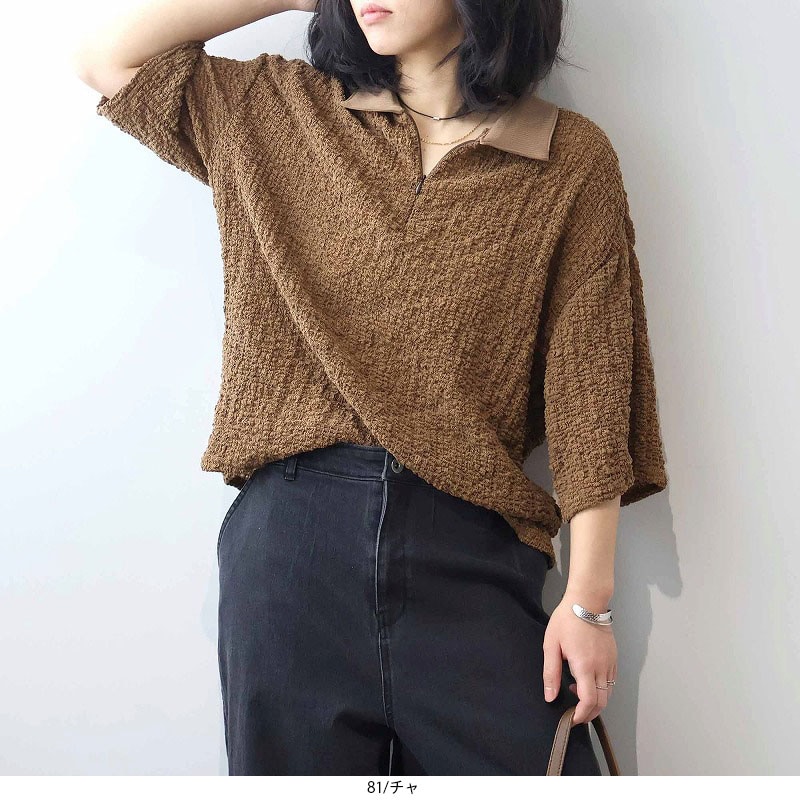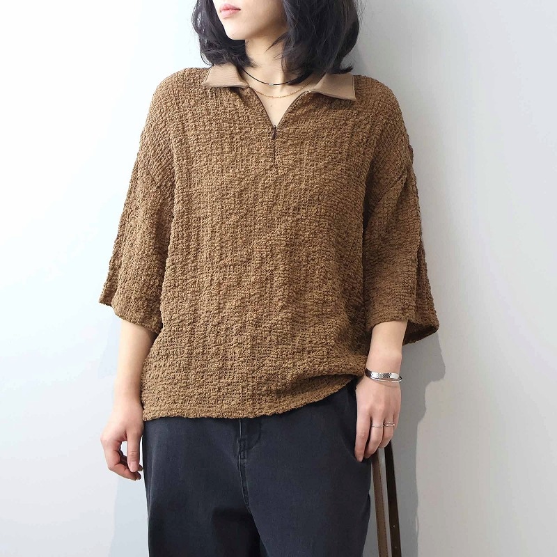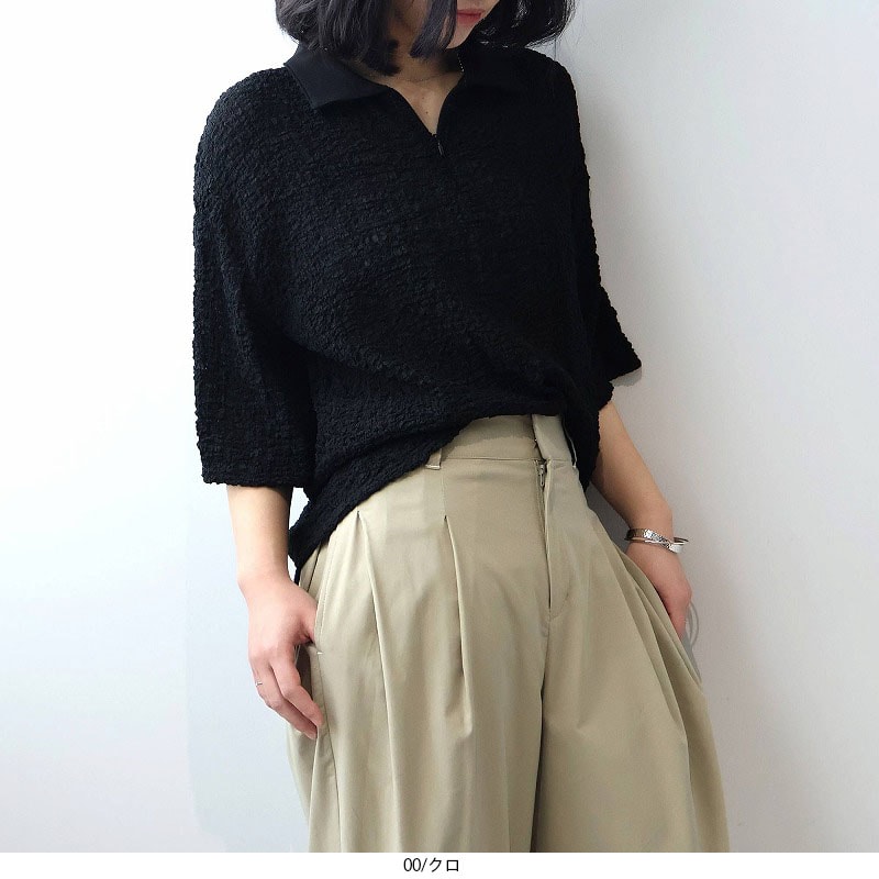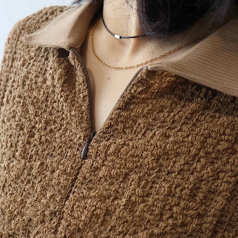 今季注目のトレンドの襟付きカットソーをシャーリングニットという表情豊かな素材で洗練させたハーフZIPプルオーバーです。