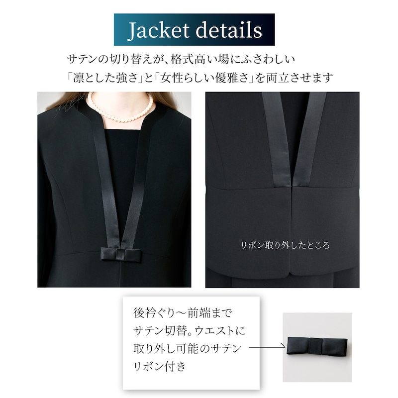 ウエスト部分にあしらったサテンの切り替えが、全体の印象を上品に引き締めるアクセント。世代を問わず長く愛用いただける、飽きのこない端正なシルエットに仕上げました。