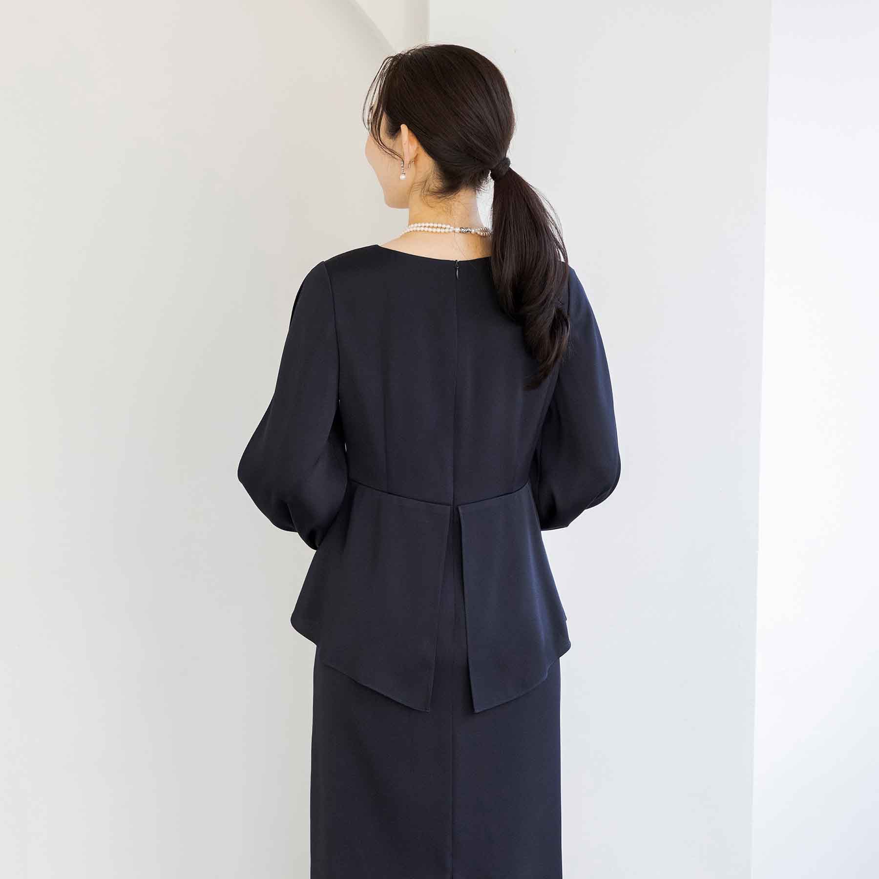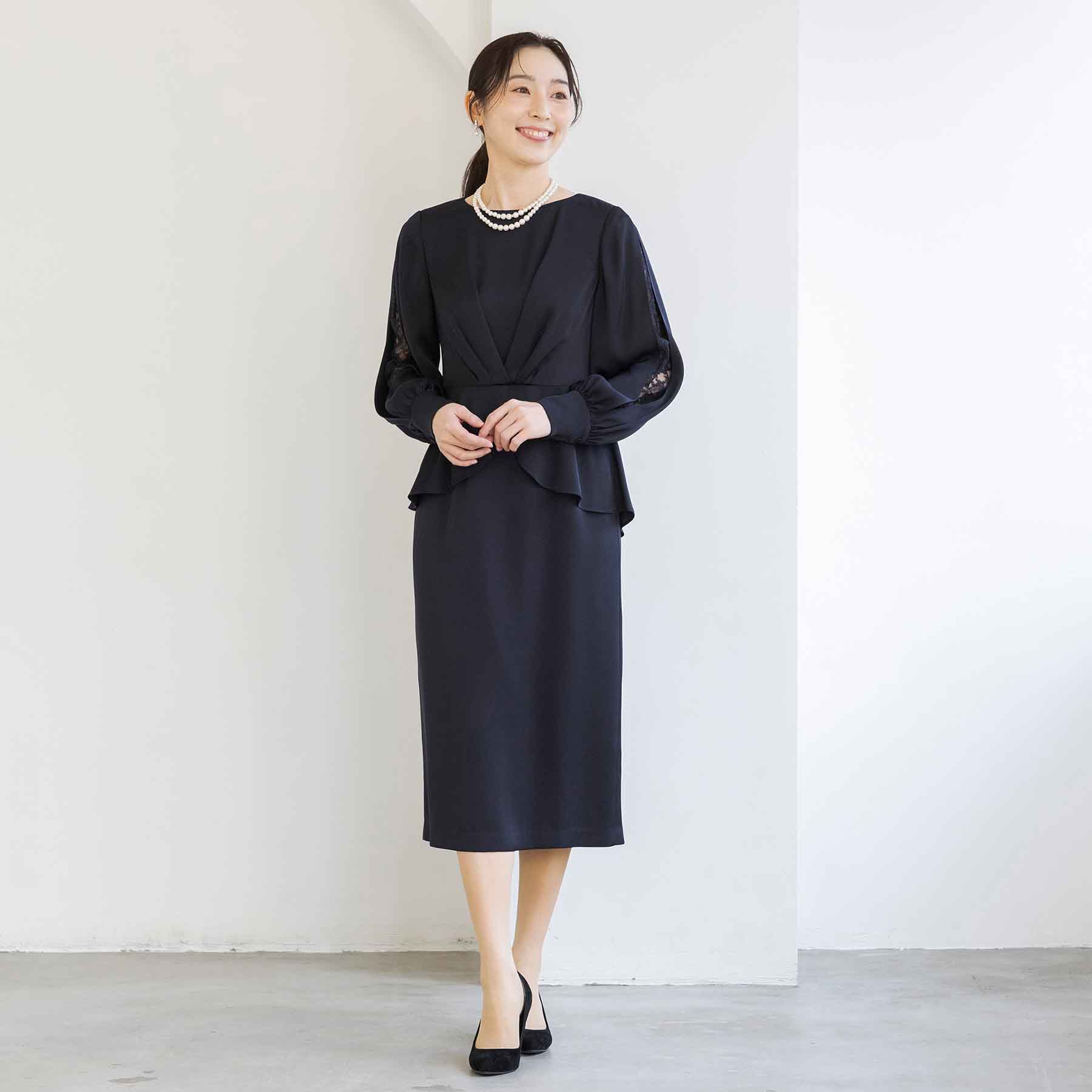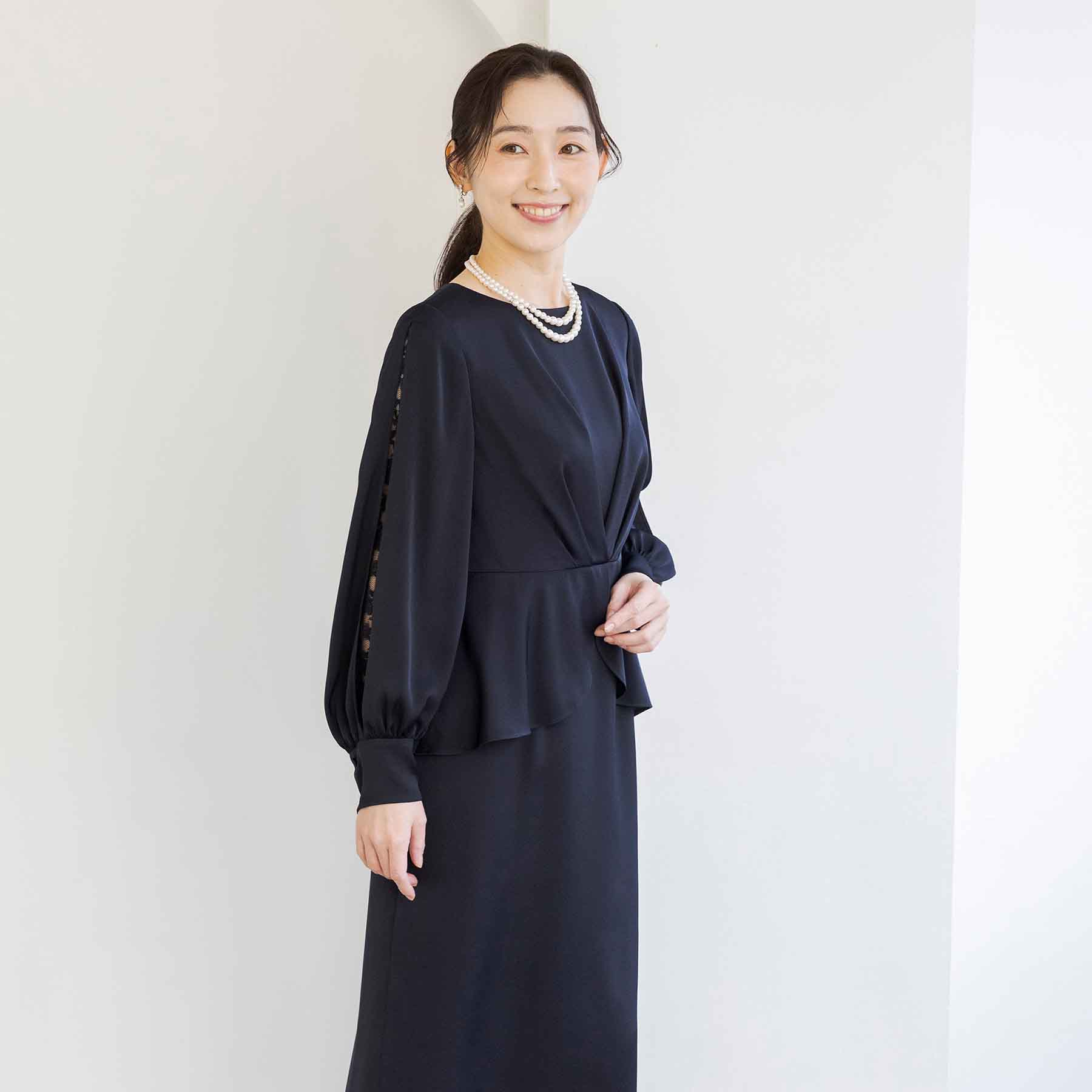 袖のスリットから見えるレースと流れるようなペプラムがポイント。