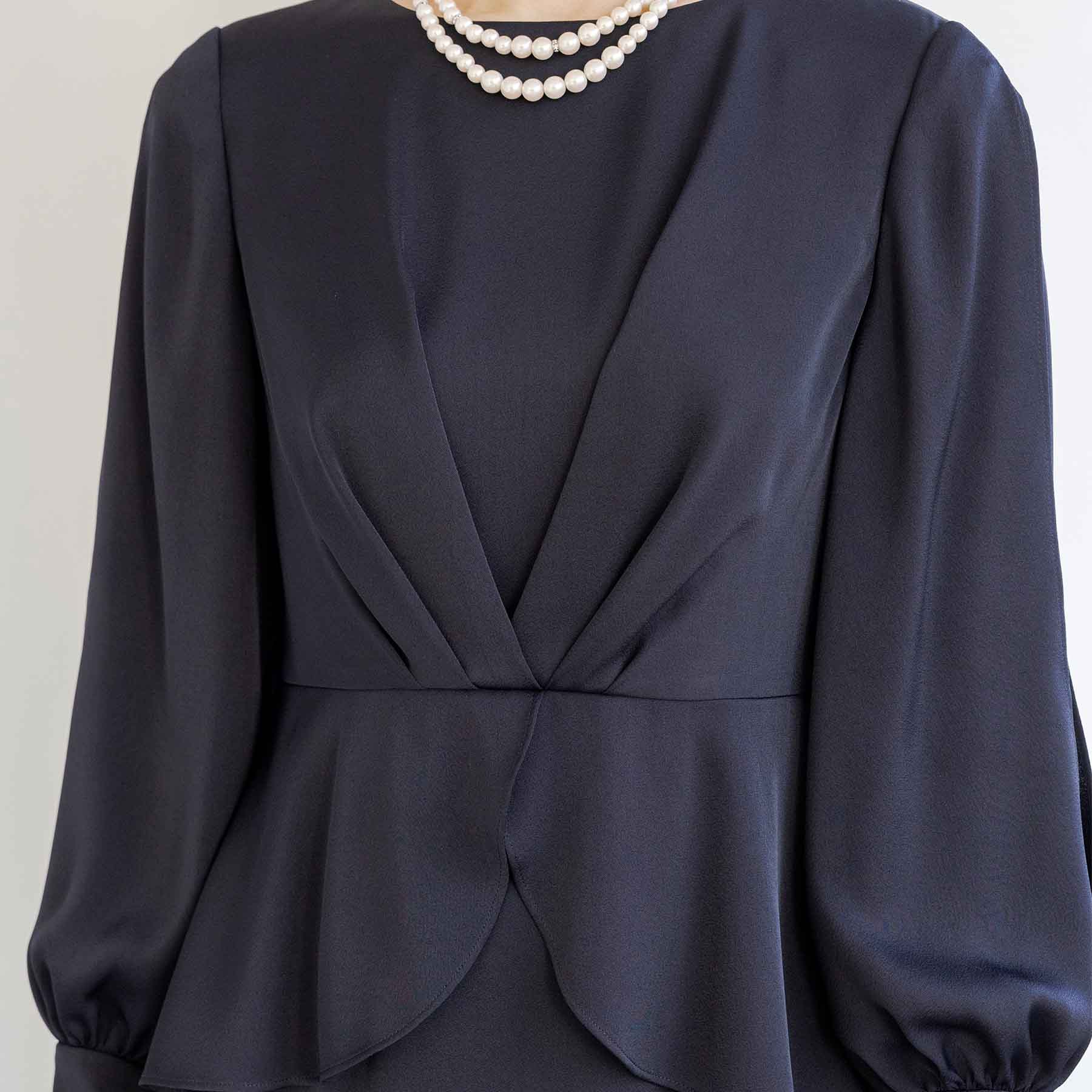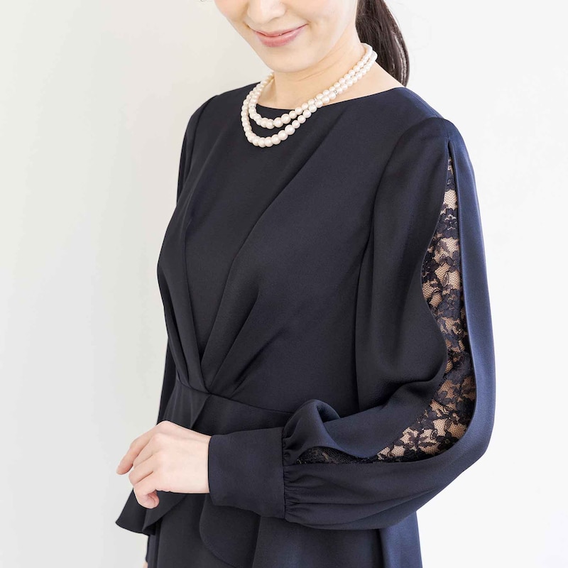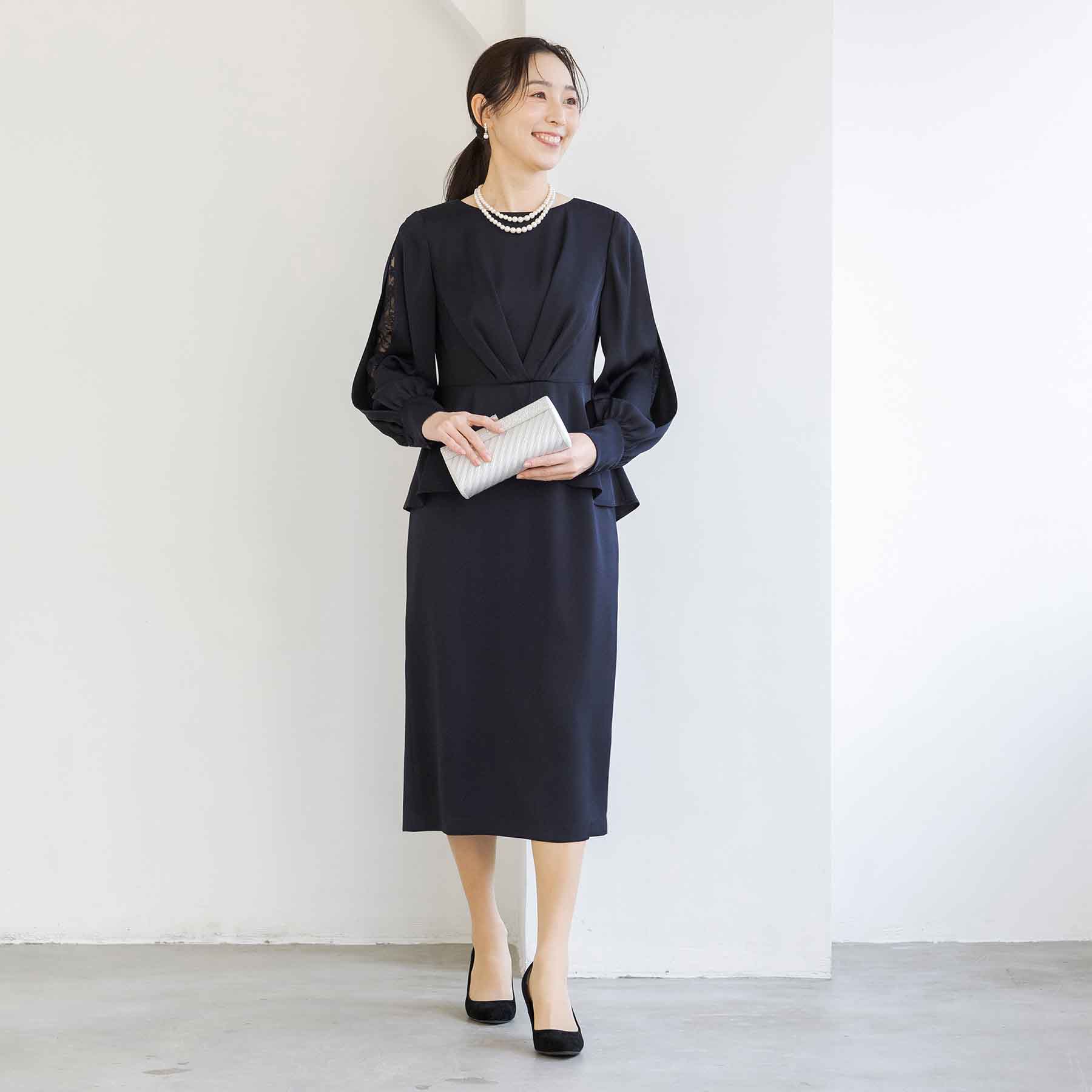 袖のスリットから見えるレースと流れるようなペプラムがポイント。