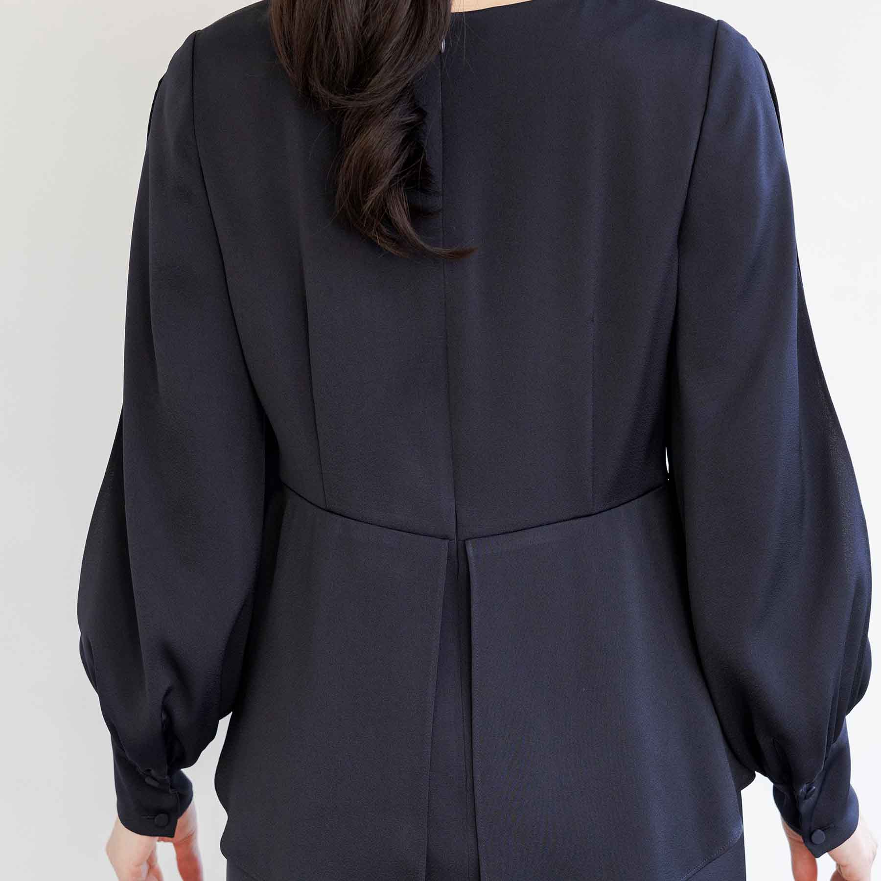 袖口は着脱しやすいギャザー仕様、ペプラムは腰周りをしっかり体型カバーします。