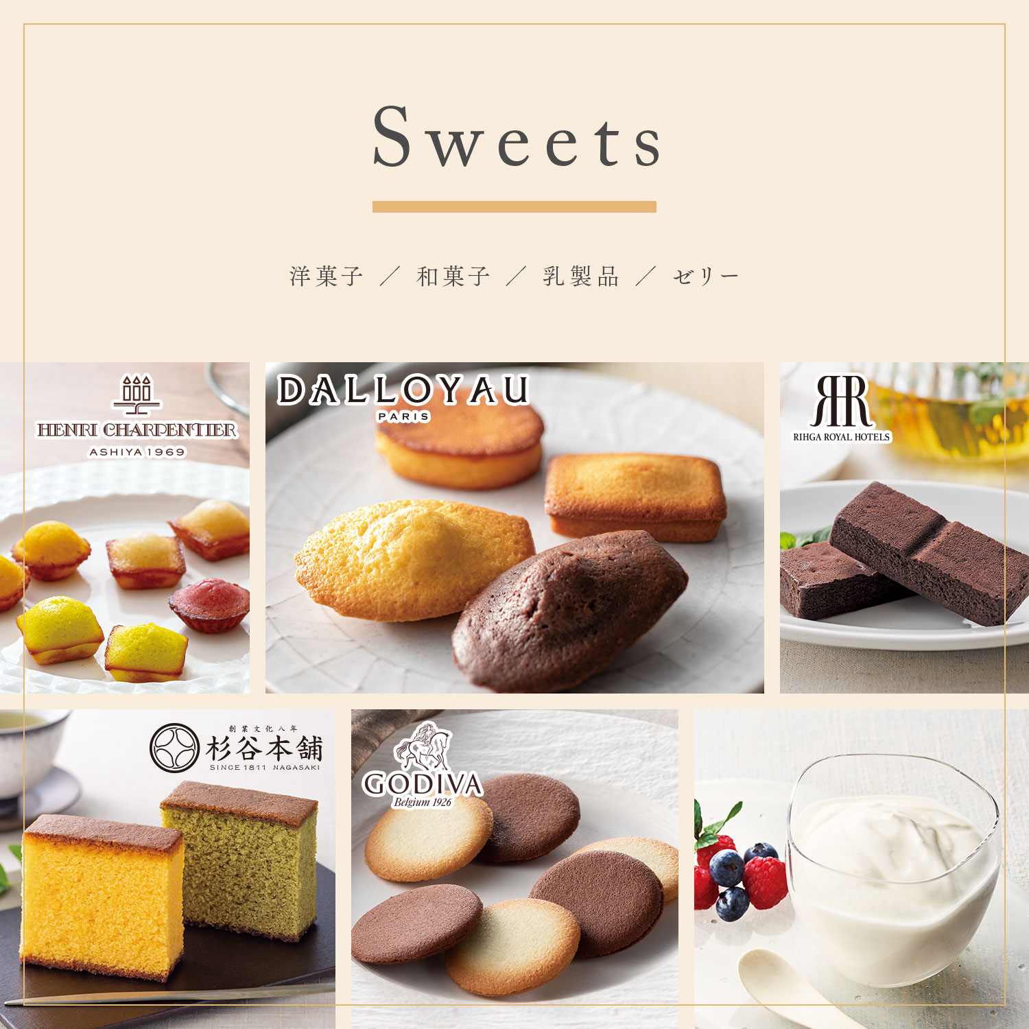 もらって嬉しいゴディバやダロワイヨのほか、静岡県産いちごや長野県産桃など季節のフルーツは家族の団らんに。