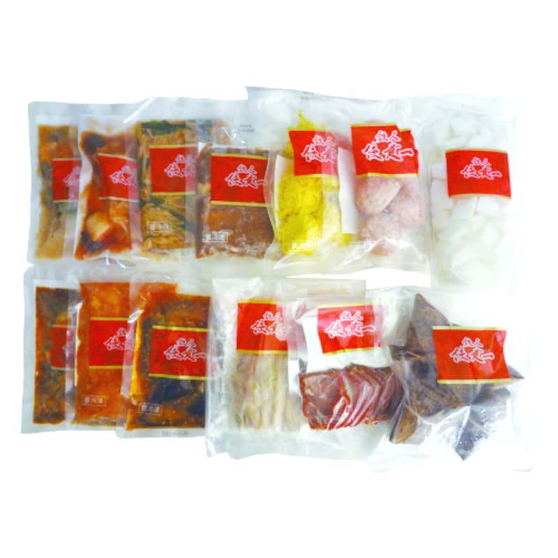 ●セット内容/13種類13パック(乾焼大蝦仁180g、本格四川麻婆豆腐150g、酢豚150g、麻婆茄子150g、本格八宝菜150g、青椒肉絲150g、東坡肉150g、棒々鶏150g、焼豚スライス100g、錦糸焼売5個入125g、珍珠丸子5個入175g、角煮入りちまき4個入240g、杏仁豆腐500g:各1パック)